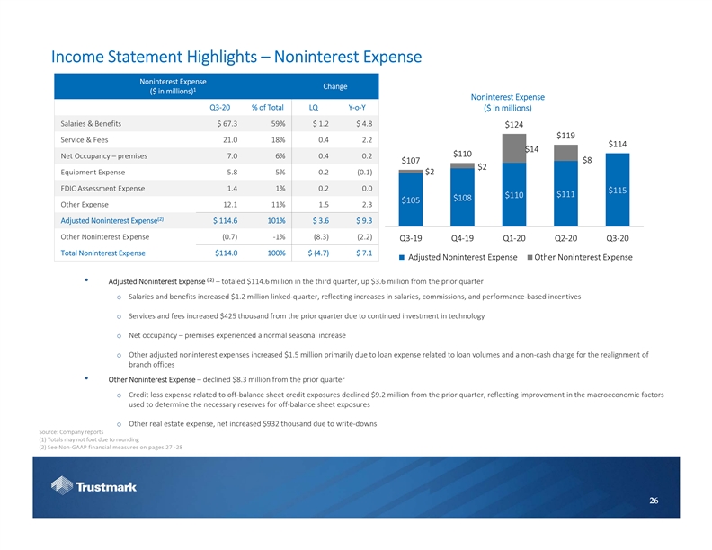Income Statement Highlights – Mortgage Banking Mortgage Banking Income Change • Mortgage loan production in the third quarter totaled ($ in millions) $885.8 million, an increase of 3.8% from the prior Q3‐20 LQ Y‐o‐Y quarter and a 56.5% increase year‐over‐year Mortgage servicing income, net $ 5.7 $ (0.2) $ 0.1 • Retail production represented 70.2% of volume, or Change in fair value – MSR from runoff (4.6) (0.4) (1.0) $621.7 million, in the third quarter Gain on sales of loans, net 34.5 0.4 24.7 • Gain on sales of loans, net totaled $34.5 million in the third quarter, up $394 thousand from the prior Mortgage banking income, excl. hedge $ 35.6 $ (0.1) $ 23.7 quarter Net hedge ineffectiveness 0.8 2.8 4.5 • Mortgage banking income, net totaled $36.4 million, Mortgage Banking Income, net $ 36.4 $ 2.7 $ 28.3 up $2.7 million, or 8.0%, from the prior quarter Mortgage Loan Production ($ in millions) $885.8 $853.3 30% 29% $566.2 $498.5 $457.2 29% 27% 27% 70% 71% 71% 73% 73% Q3‐19 Q4‐19 Q1‐20 Q2‐20 Q3‐20 Retail Wholesale Source: Company reports 25Income Statement Highlights – Mortgage Banking Mortgage Banking Income Change • Mortgage loan production in the third quarter totaled ($ in millions) $885.8 million, an increase of 3.8% from the prior Q3‐20 LQ Y‐o‐Y quarter and a 56.5% increase year‐over‐year Mortgage servicing income, net $ 5.7 $ (0.2) $ 0.1 • Retail production represented 70.2% of volume, or Change in fair value – MSR from runoff (4.6) (0.4) (1.0) $621.7 million, in the third quarter Gain on sales of loans, net 34.5 0.4 24.7 • Gain on sales of loans, net totaled $34.5 million in the third quarter, up $394 thousand from the prior Mortgage banking income, excl. hedge $ 35.6 $ (0.1) $ 23.7 quarter Net hedge ineffectiveness 0.8 2.8 4.5 • Mortgage banking income, net totaled $36.4 million, Mortgage Banking Income, net $ 36.4 $ 2.7 $ 28.3 up $2.7 million, or 8.0%, from the prior quarter Mortgage Loan Production ($ in millions) $885.8 $853.3 30% 29% $566.2 $498.5 $457.2 29% 27% 27% 70% 71% 71% 73% 73% Q3‐19 Q4‐19 Q1‐20 Q2‐20 Q3‐20 Retail Wholesale Source: Company reports 25