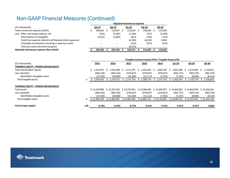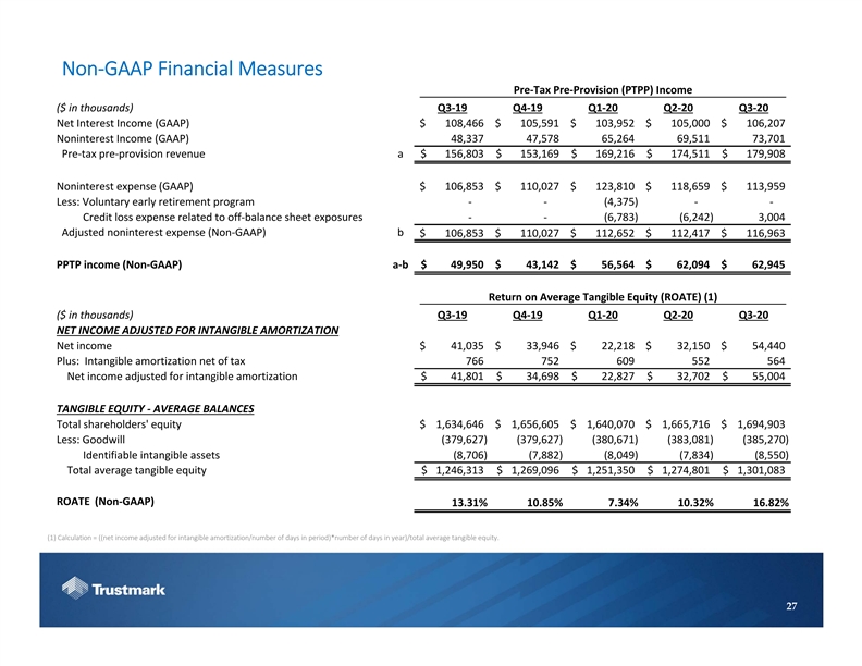 Non‐GAAP Financial Measures Pre‐Tax Pre‐Provision (PTPP) Income ($ in thousands) Q3‐19 Q4‐19 Q1‐20 Q2‐20 Q3‐20 Net Interest Income (GAAP) $ 108,466 $ 105,591 $ 103,952 $ 105,000 $ 106,207 Noninterest Income (GAAP) 48,337 47,578 65,264 69,511 73,701 Pre‐tax pre‐provision revenue a $ 156,803 $ 153,169 $ 169,216 $ 174,511 $ 179,908 Noninterest expense (GAAP) $ 106,853 $ 110,027 $ 123,810 $ 118,659 $ 113,959 Less: Voluntary early retirement program ‐ ‐ (4,375) ‐ ‐ Credit loss expense related to off‐balance sheet exposures ‐ ‐ (6,783) (6,242) 3,004 Adjusted noninterest expense (Non‐GAAP) b $ 106,853 $ 110,027 $ 112,652 $ 112,417 $ 116,963 PPTP income (Non‐GAAP) a‐b $ 49,950 $ 43,142 $ 56,564 $ 62,094 $ 62,945 Return on Average Tangible Equity (ROATE) (1) ($ in thousands) Q3‐19 Q4‐19 Q1‐20 Q2‐20 Q3‐20 NET INCOME ADJUSTED FOR INTANGIBLE AMORTIZATION Net income $ 41,035 $ 33,946 $ 22,218 $ 32,150 $ 54,440 Plus: Intangible amortization net of tax 766 752 609 552 564 Net income adjusted for intangible amortization $ 41,801 $ 34,698 $ 22,827 $ 32,702 $ 55,004 TANGIBLE EQUITY ‐ AVERAGE BALANCES Total shareholders' equity $ 1,634,646 $ 1,656,605 $ 1,640,070 $ 1,665,716 $ 1,694,903 Less: Goodwill (379,627) (379,627) (380,671) (383,081) (385,270) Identifiable intangible assets (8,706) (7,882) (8,049) (7,834) (8,550) Total average tangible equity $ 1,246,313 $ 1,269,096 $ 1,251,350 $ 1,274,801 $ 1,301,083 ROATE (Non‐GAAP) 13.31% 10.85% 7.34% 10.32% 16.82% (1) Calculation = ((net income adjusted for intangible amortization/number of days in period)*number of days in year)/total average tangible equity. 27Non‐GAAP Financial Measures Pre‐Tax Pre‐Provision (PTPP) Income ($ in thousands) Q3‐19 Q4‐19 Q1‐20 Q2‐20 Q3‐20 Net Interest Income (GAAP) $ 108,466 $ 105,591 $ 103,952 $ 105,000 $ 106,207 Noninterest Income (GAAP) 48,337 47,578 65,264 69,511 73,701 Pre‐tax pre‐provision revenue a $ 156,803 $ 153,169 $ 169,216 $ 174,511 $ 179,908 Noninterest expense (GAAP) $ 106,853 $ 110,027 $ 123,810 $ 118,659 $ 113,959 Less: Voluntary early retirement program ‐ ‐ (4,375) ‐ ‐ Credit loss expense related to off‐balance sheet exposures ‐ ‐ (6,783) (6,242) 3,004 Adjusted noninterest expense (Non‐GAAP) b $ 106,853 $ 110,027 $ 112,652 $ 112,417 $ 116,963 PPTP income (Non‐GAAP) a‐b $ 49,950 $ 43,142 $ 56,564 $ 62,094 $ 62,945 Return on Average Tangible Equity (ROATE) (1) ($ in thousands) Q3‐19 Q4‐19 Q1‐20 Q2‐20 Q3‐20 NET INCOME ADJUSTED FOR INTANGIBLE AMORTIZATION Net income $ 41,035 $ 33,946 $ 22,218 $ 32,150 $ 54,440 Plus: Intangible amortization net of tax 766 752 609 552 564 Net income adjusted for intangible amortization $ 41,801 $ 34,698 $ 22,827 $ 32,702 $ 55,004 TANGIBLE EQUITY ‐ AVERAGE BALANCES Total shareholders' equity $ 1,634,646 $ 1,656,605 $ 1,640,070 $ 1,665,716 $ 1,694,903 Less: Goodwill (379,627) (379,627) (380,671) (383,081) (385,270) Identifiable intangible assets (8,706) (7,882) (8,049) (7,834) (8,550) Total average tangible equity $ 1,246,313 $ 1,269,096 $ 1,251,350 $ 1,274,801 $ 1,301,083 ROATE (Non‐GAAP) 13.31% 10.85% 7.34% 10.32% 16.82% (1) Calculation = ((net income adjusted for intangible amortization/number of days in period)*number of days in year)/total average tangible equity. 27