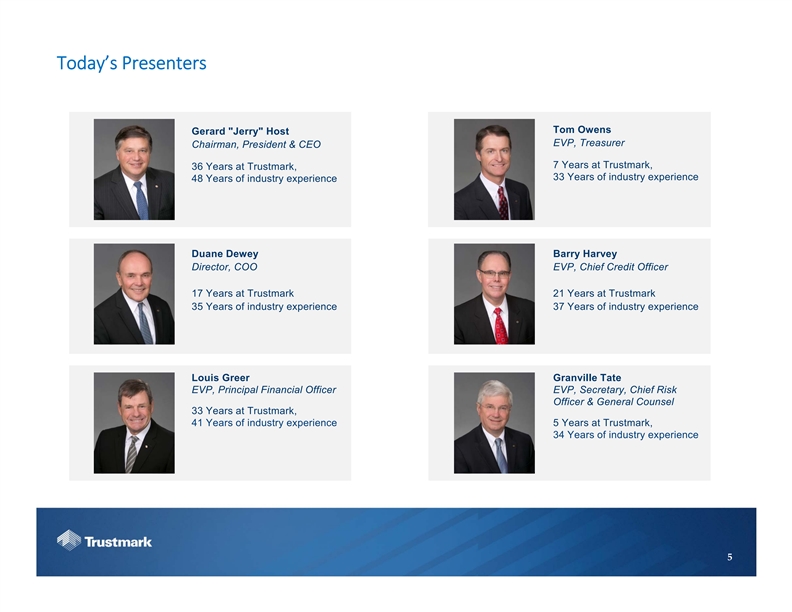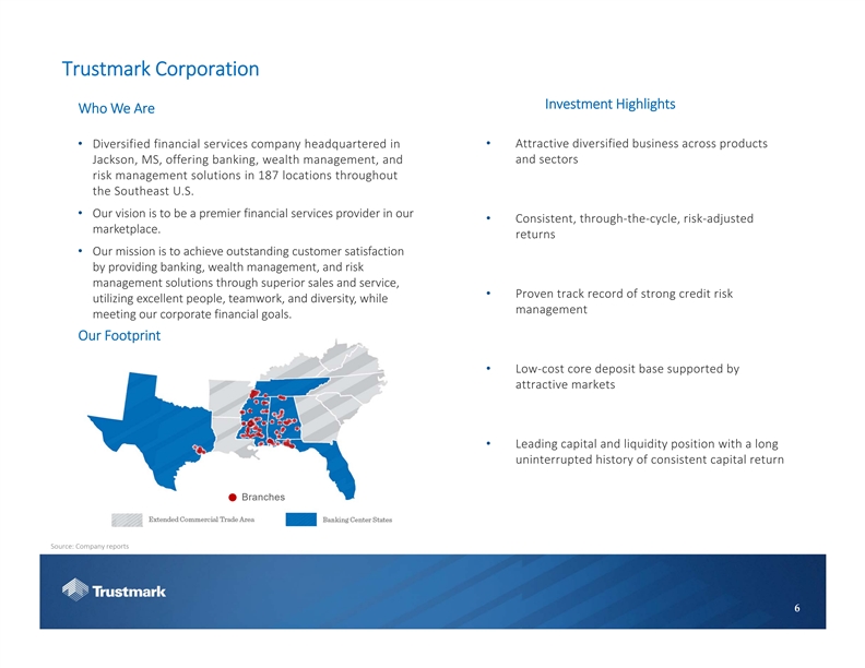 Today’s Presenters Tom Owens Gerard Jerry Host EVP, Treasurer Chairman, President & CEO 7 Years at Trustmark, 36 Years at Trustmark, 33 Years of industry experience 48 Years of industry experience Duane Dewey Barry Harvey Director, COO EVP, Chief Credit Officer 17 Years at Trustmark 21 Years at Trustmark 35 Years of industry experience 37 Years of industry experience Louis Greer Granville Tate EVP, Principal Financial Officer EVP, Secretary, Chief Risk Officer & General Counsel 33 Years at Trustmark, 41 Years of industry experience 5 Years at Trustmark, 34 Years of industry experience 5Today’s Presenters Tom Owens Gerard Jerry Host EVP, Treasurer Chairman, President & CEO 7 Years at Trustmark, 36 Years at Trustmark, 33 Years of industry experience 48 Years of industry experience Duane Dewey Barry Harvey Director, COO EVP, Chief Credit Officer 17 Years at Trustmark 21 Years at Trustmark 35 Years of industry experience 37 Years of industry experience Louis Greer Granville Tate EVP, Principal Financial Officer EVP, Secretary, Chief Risk Officer & General Counsel 33 Years at Trustmark, 41 Years of industry experience 5 Years at Trustmark, 34 Years of industry experience 5