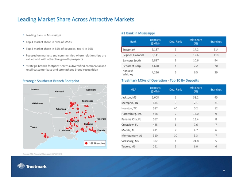 Trustmark Corporation Investment Highlights Who We Are • Attractive diversified business across products • Diversified financial services company headquartered in Jackson, MS, offering banking, wealth management, and and sectors risk management solutions in 187 locations throughout the Southeast U.S. • Our vision is to be a premier financial services provider in our • Consistent, through‐the‐cycle, risk‐adjusted marketplace. returns • Our mission is to achieve outstanding customer satisfaction by providing banking, wealth management, and risk management solutions through superior sales and service, • Proven track record of strong credit risk utilizing excellent people, teamwork, and diversity, while management meeting our corporate financial goals. Our Footprint • Low‐cost core deposit base supported by attractive markets • Leading capital and liquidity position with a long uninterrupted history of consistent capital return Branches Source: Company reports 6Trustmark Corporation Investment Highlights Who We Are • Attractive diversified business across products • Diversified financial services company headquartered in Jackson, MS, offering banking, wealth management, and and sectors risk management solutions in 187 locations throughout the Southeast U.S. • Our vision is to be a premier financial services provider in our • Consistent, through‐the‐cycle, risk‐adjusted marketplace. returns • Our mission is to achieve outstanding customer satisfaction by providing banking, wealth management, and risk management solutions through superior sales and service, • Proven track record of strong credit risk utilizing excellent people, teamwork, and diversity, while management meeting our corporate financial goals. Our Footprint • Low‐cost core deposit base supported by attractive markets • Leading capital and liquidity position with a long uninterrupted history of consistent capital return Branches Source: Company reports 6