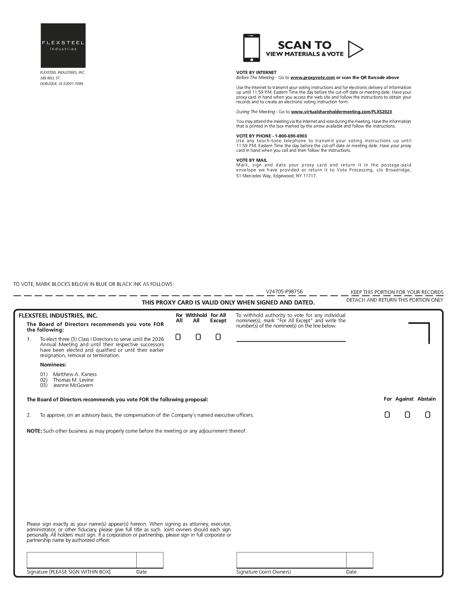 • | providing written notice of revocation to our Secretary at Flexsteel Industries, Inc., 385 Bell St, Dubuque, Iowa 52001-7004 prior to or at the meeting; or |