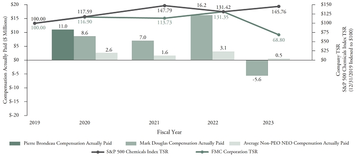 The following chart sets forth the relationship between Compensation Actually Paid to our PEOs, the average of Compensation Actually Paid to our Non-PEO NEOs, and the cumulative TSR over the four most recently completed fiscal years for the Company and the S&P 500 Chemicals Index.
