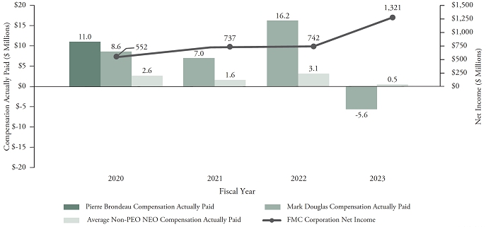 | Year (a)  | for Pierre Brondeau(1) ($) (b)  | for Mark Douglas(1) ($) (b)  | Paid to Pierre Brondeau(1,2,3) ($) (c)  | Paid to Mark Douglas(1,2,3) ($) (c)  | for Non-PEO NEOs(1) ($) (d)  | to Non-PEO NEOs(1,2,3) ($) (e)  | TSR ($) (f)  | Peer Group TSR ($) (g)  | Net Income ($ Millions) (h)  | 1-Year Relative TSR(5) (i)  | ||||||||||