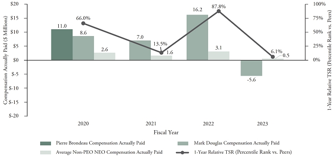 The following chart sets forth the relationship between Compensation Actually Paid to our PEO, the average of Compensation Actually Paid to our other NEOs, and our 1-Year Relative TSR (Percentile Rank vs. Peers) during the four most recently completed fiscal years.