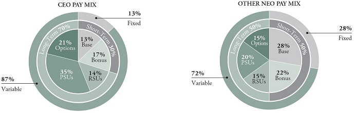 The market value for each NEO’s unvested restricted stock units and stock option awards as of year-end 2023 is set forth in the relevant section of Column (b) of the table above. A value for each NEO’s performance-based restricted stock unit awards, with the payout for banked units based on actual performance and the payout for unvested units calculated based on an assumed level of performance at target and prorated to reflect time employed during the applicable performance period, is set forth in the relevant section of Column (c) of the table above.