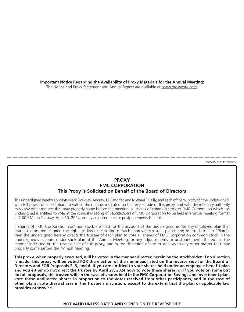 The Board of Directors (also referred to herein as the “Board”) of FMC Corporation (the “Company” or “FMC”) is soliciting proxies for use at the Company’s 2024 Annual Meeting of Stockholders and any postponements or adjournments of that meeting (as so postponed or adjourned, the “2024 Annual Meeting” or the “Annual Meeting”). As permitted by Securities and Exchange Commission (“SEC”) rules, we are making this proxy statement available to our stockholders electronically via the internet on our Investor Relations page at investors. fmc.com/financials/annual-reports-and-proxy-statements/. On or about March 15, 2024, we first mailed to our stockholders a Notice containing instructions on how to access this proxy statement, the accompanying form of proxy and the Company’s Annual Report for 2023. If you received a Notice by mail, you will not receive a printed copy of the proxy materials in the mail. Instead, the Notice instructs you on how to access and review all of the important information contained in the proxy statement. The Notice also instructs you on how you may submit your proxy over the internet. If you received a Notice by mail and would like to receive a printed copy of our proxy materials, you should follow the instructions for requesting such materials contained on the Notice.