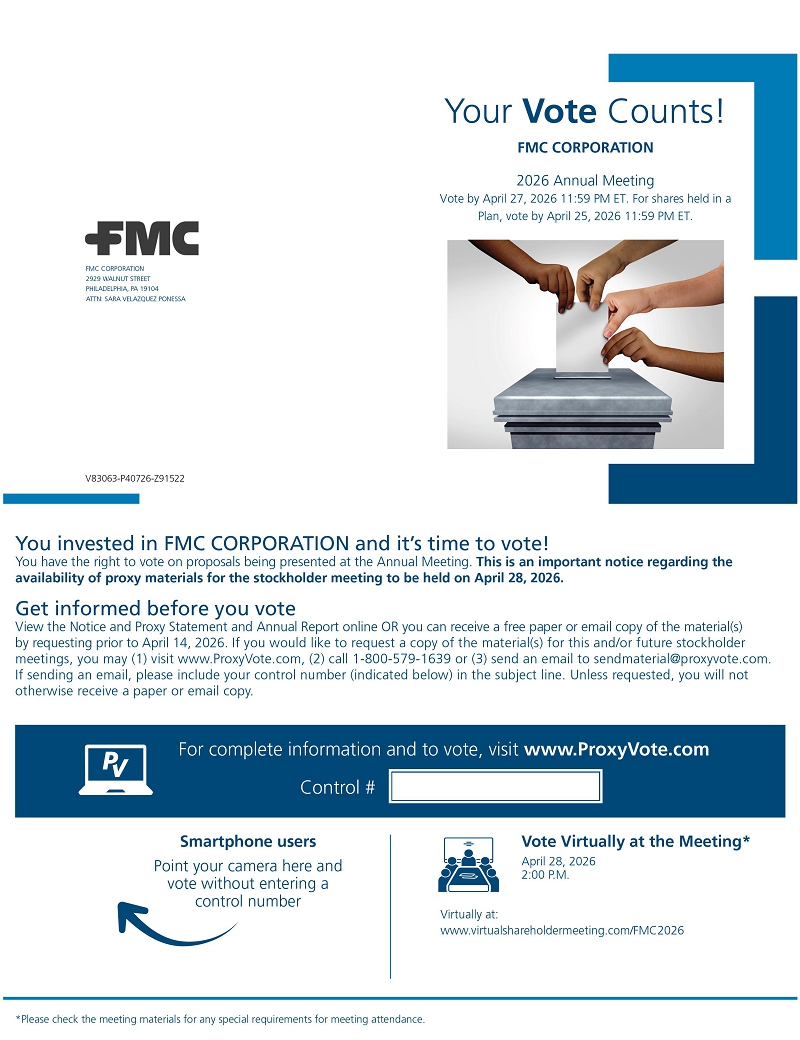 Your Vote Counts! *Please check the meeting materials for any special requirements for meeting attendance. Smartphone users Point your camera here and vote without entering a control number For complete information and to vote, visit www.ProxyVote.com Control # V83063-P40726-Z91522 FMC CORPORATION 2929 WALNUT STREET PHILADELPHIA, PA 19104 ATTN: SARA VELAZQUEZ PONESSA Vote Virtually at the Meeting* April 28, 2026 2:00 P.M. Virtually at: www.virtualshareholdermeeting.com/FMC2026 FMC CORPORATION 2026 Annual Meeting Vote by April 27, 2026 11:59 PM ET. For shares held in a Plan, vote by April 25, 2026 11:59 PM ET. You invested in FMC CORPORATION and it’s time to vote! You have the right to vote on proposals being presented at the Annual Meeting. This is an important notice regarding the availability of proxy materials for the stockholder meeting to be held on April 28, 2026. Get informed before you vote View the Notice and Proxy Statement and Annual Report online OR you can receive a free paper or email copy of the material(s) by requesting prior to April 14, 2026. If you would like to request a copy of the material(s) for this and/or future stockholder meetings, you may (1) visit www.ProxyVote.com, (2) call 1-800-579-1639 or (3) send an email to sendmaterial@proxyvote.com. If sending an email, please include your control number (indicated below) in the subject line. Unless requested, you will not otherwise receive a paper or email copy.