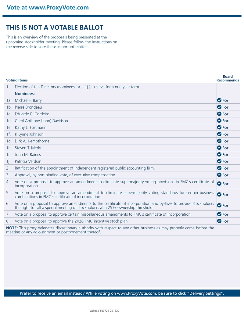 Vote at www.ProxyVote.com Prefer to receive an email instead? While voting on www.ProxyVote.com, be sure to click “Delivery Settings”. Voting Items Board Recommends V83064-P40726-Z91522 THIS IS NOT A VOTABLE BALLOT This is an overview of the proposals being presented at the upcoming stockholder meeting. Please follow the instructions on the reverse side to vote these important matters. 1. Election of ten Directors (nominees 1a. - 1j.) to serve for a one-year term. Nominees: 1a. Michael F. Barry For 1b. Pierre Brondeau For 1c. Eduardo E. Cordeiro For 1d. Carol Anthony (John) Davidson For 1e. Kathy L. Fortmann For 1f. K’Lynne Johnson For 1g. Dirk A. Kempthorne For 1h. Steven T. Merkt For 1i. John M. Raines For 1j. Patricia Verduin For 2. Ratification of the appointment of independent registered public accounting firm. For 3. Approval, by non-binding vote, of executive compensation. For 4. Vote on a proposal to approve an amendment to eliminate supermajority voting provisions in FMC’s certificate of incorporation. For 5. Vote on a proposal to approve an amendment to eliminate supermajority voting standards for certain business combinations in FMC’s certificate of incorporation. For 6. Vote on a proposal to approve amendments to the certificate of incorporation and by-laws to provide stockholders the right to call a special meeting of stockholders at a 25% ownership threshold. For 7. Vote on a proposal to approve certain miscellaneous amendments to FMC’s certificate of incorporation. For 8. Vote on a proposal to approve the 2026 FMC incentive stock plan. For NOTE: This proxy delegates discretionary authority with respect to any other business as may properly come before the meeting or any adjournment or postponement thereof.
