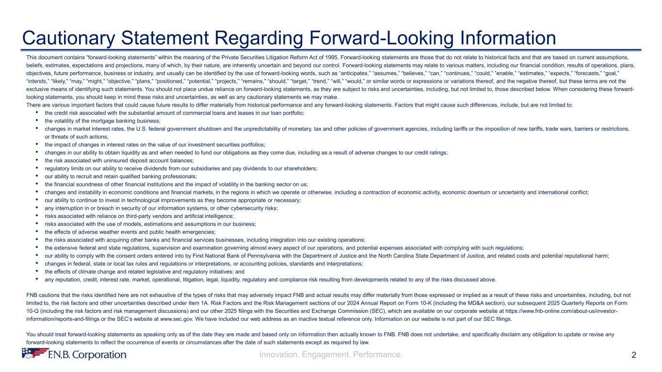 Innovation. Engagement. Performance. 2 Cautionary Statement Regarding Forward-Looking Information This document contains “forward-looking statements” within the meaning of the Private Securities Litigation Reform Act of 1995. Forward-looking statements are those that do not relate to historical facts and that are based on current assumptions, beliefs, estimates, expectations and projections, many of which, by their nature, are inherently uncertain and beyond our control. Forward-looking statements may relate to various matters, including our financial condition, results of operations, plans, objectives, future performance, business or industry, and usually can be identified by the use of forward-looking words, such as “anticipates,” “assumes,” “believes,” “can,” “continues,” “could,” ”enable,” “estimates,” “expects,” “forecasts,” “goal,” “intends,” “likely,” “may,” “might,” “objective,” “plans,” “positioned,” “potential,” “projects,” “remains,” “should,” “target,” “trend,” “will,” “would,” or similar words or expressions or variations thereof, and the negative thereof, but these terms are not the exclusive means of identifying such statements. You should not place undue reliance on forward-looking statements, as they are subject to risks and uncertainties, including, but not limited to, those described below. When considering these forward- looking statements, you should keep in mind these risks and uncertainties, as well as any cautionary statements we may make. There are various important factors that could cause future results to differ materially from historical performance and any forward-looking statements. Factors that might cause such differences, include, but are not limited to: • the credit risk associated with the substantial amount of commercial loans and leases in our loan portfolio; • the volatility of the mortgage banking business; • changes in market interest rates, the U.S. federal government shutdown and the unpredictability of monetary, tax and other policies of government agencies, including tariffs or the imposition of new tariffs, trade wars, barriers or restrictions, or threats of such actions; • the impact of changes in interest rates on the value of our investment securities portfolios; • changes in our ability to obtain liquidity as and when needed to fund our obligations as they come due, including as a result of adverse changes to our credit ratings; • the risk associated with uninsured deposit account balances; • regulatory limits on our ability to receive dividends from our subsidiaries and pay dividends to our shareholders; • our ability to recruit and retain qualified banking professionals; • the financial soundness of other financial institutions and the impact of volatility in the banking sector on us; • changes and instability in economic conditions and financial markets, in the regions in which we operate or otherwise, including a contraction of economic activity, economic downturn or uncertainty and international conflict; • our ability to continue to invest in technological improvements as they become appropriate or necessary; • any interruption in or breach in security of our information systems, or other cybersecurity risks; • risks associated with reliance on third-party vendors and artificial intelligence; • risks associated with the use of models, estimations and assumptions in our business; • the effects of adverse weather events and public health emergencies; • the risks associated with acquiring other banks and financial services businesses, including integration into our existing operations; • the extensive federal and state regulations, supervision and examination governing almost every aspect of our operations, and potential expenses associated with complying with such regulations; • our ability to comply with the consent orders entered into by First National Bank of Pennsylvania with the Department of Justice and the North Carolina State Department of Justice, and related costs and potential reputational harm; • changes in federal, state or local tax rules and regulations or interpretations, or accounting policies, standards and interpretations; • the effects of climate change and related legislative and regulatory initiatives; and • any reputation, credit, interest rate, market, operational, litigation, legal, liquidity, regulatory and compliance risk resulting from developments related to any of the risks discussed above. FNB cautions that the risks identified here are not exhaustive of the types of risks that may adversely impact FNB and actual results may differ materially from those expressed or implied as a result of these risks and uncertainties, including, but not limited to, the risk factors and other uncertainties described under Item 1A. Risk Factors and the Risk Management sections of our 2024 Annual Report on Form 10-K (including the MD&A section), our subsequent 2025 Quarterly Reports on Form 10-Q (including the risk factors and risk management discussions) and our other 2025 filings with the Securities and Exchange Commission (SEC), which are available on our corporate website at https://www.fnb-online.com/about-us/investor- information/reports-and-filings or the SEC’s website at www.sec.gov. We have included our web address as an inactive textual reference only. Information on our website is not part of our SEC filings. You should treat forward-looking statements as speaking only as of the date they are made and based only on information then actually known to FNB. FNB does not undertake, and specifically disclaim any obligation to update or revise any forward-looking statements to reflect the occurrence of events or circumstances after the date of such statements except as required by law.