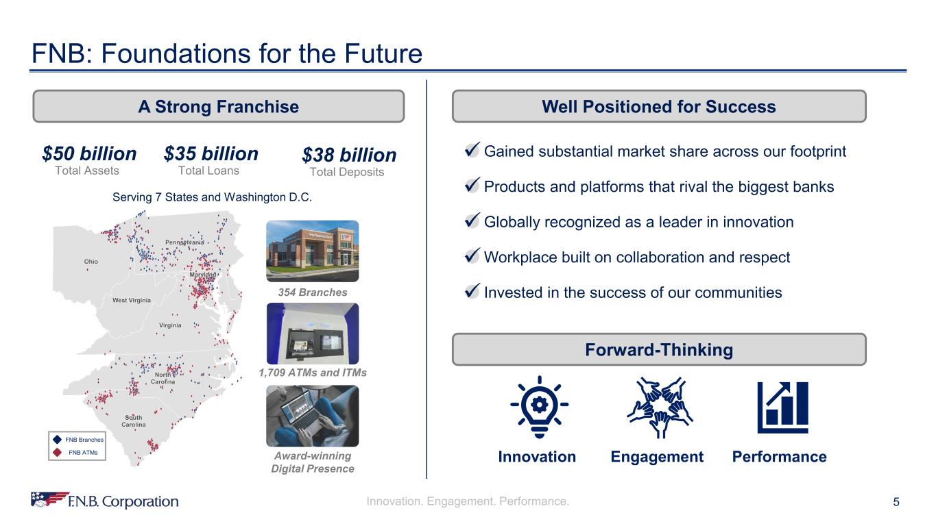 Innovation. Engagement. Performance. 2 Cautionary Statement Regarding Forward-Looking Information This document contains “forward-looking statements” within the meaning of the Private Securities Litigation Reform Act of 1995. Forward-looking statements are those that do not relate to historical facts and that are based on current assumptions, beliefs, estimates, expectations and projections, many of which, by their nature, are inherently uncertain and beyond our control. Forward-looking statements may relate to various matters, including our financial condition, results of operations, plans, objectives, future performance, business or industry, and usually can be identified by the use of forward-looking words, such as “anticipates,” “assumes,” “believes,” “can,” “continues,” “could,” ”enable,” “estimates,” “expects,” “forecasts,” “goal,” “intends,” “likely,” “may,” “might,” “objective,” “plans,” “positioned,” “potential,” “projects,” “remains,” “should,” “target,” “trend,” “will,” “would,” or similar words or expressions or variations thereof, and the negative thereof, but these terms are not the exclusive means of identifying such statements. You should not place undue reliance on forward-looking statements, as they are subject to risks and uncertainties, including, but not limited to, those described below. When considering these forward- looking statements, you should keep in mind these risks and uncertainties, as well as any cautionary statements we may make. There are various important factors that could cause future results to differ materially from historical performance and any forward-looking statements. Factors that might cause such differences, include, but are not limited to: • the credit risk associated with the substantial amount of commercial loans and leases in our loan portfolio; • the volatility of the mortgage banking business; • changes in market interest rates, the U.S. federal government shutdown and the unpredictability of monetary, tax and other policies of government agencies, including tariffs or the imposition of new tariffs, trade wars, barriers or restrictions, or threats of such actions; • the impact of changes in interest rates on the value of our investment securities portfolios; • changes in our ability to obtain liquidity as and when needed to fund our obligations as they come due, including as a result of adverse changes to our credit ratings; • the risk associated with uninsured deposit account balances; • regulatory limits on our ability to receive dividends from our subsidiaries and pay dividends to our shareholders; • our ability to recruit and retain qualified banking professionals; • the financial soundness of other financial institutions and the impact of volatility in the banking sector on us; • changes and instability in economic conditions and financial markets, in the regions in which we operate or otherwise, including a contraction of economic activity, economic downturn or uncertainty and international conflict; • our ability to continue to invest in technological improvements as they become appropriate or necessary; • any interruption in or breach in security of our information systems, or other cybersecurity risks; • risks associated with reliance on third-party vendors and artificial intelligence; • risks associated with the use of models, estimations and assumptions in our business; • the effects of adverse weather events and public health emergencies; • the risks associated with acquiring other banks and financial services businesses, including integration into our existing operations; • the extensive federal and state regulations, supervision and examination governing almost every aspect of our operations, and potential expenses associated with complying with such regulations; • our ability to comply with the consent orders entered into by First National Bank of Pennsylvania with the Department of Justice and the North Carolina State Department of Justice, and related costs and potential reputational harm; • changes in federal, state or local tax rules and regulations or interpretations, or accounting policies, standards and interpretations; • the effects of climate change and related legislative and regulatory initiatives; and • any reputation, credit, interest rate, market, operational, litigation, legal, liquidity, regulatory and compliance risk resulting from developments related to any of the risks discussed above. FNB cautions that the risks identified here are not exhaustive of the types of risks that may adversely impact FNB and actual results may differ materially from those expressed or implied as a result of these risks and uncertainties, including, but not limited to, the risk factors and other uncertainties described under Item 1A. Risk Factors and the Risk Management sections of our 2024 Annual Report on Form 10-K (including the MD&A section), our subsequent 2025 Quarterly Reports on Form 10-Q (including the risk factors and risk management discussions) and our other 2025 filings with the Securities and Exchange Commission (SEC), which are available on our corporate website at https://www.fnb-online.com/about-us/investor- information/reports-and-filings or the SEC’s website at www.sec.gov. We have included our web address as an inactive textual reference only. Information on our website is not part of our SEC filings. You should treat forward-looking statements as speaking only as of the date they are made and based only on information then actually known to FNB. FNB does not undertake, and specifically disclaim any obligation to update or revise any forward-looking statements to reflect the occurrence of events or circumstances after the date of such statements except as required by law.