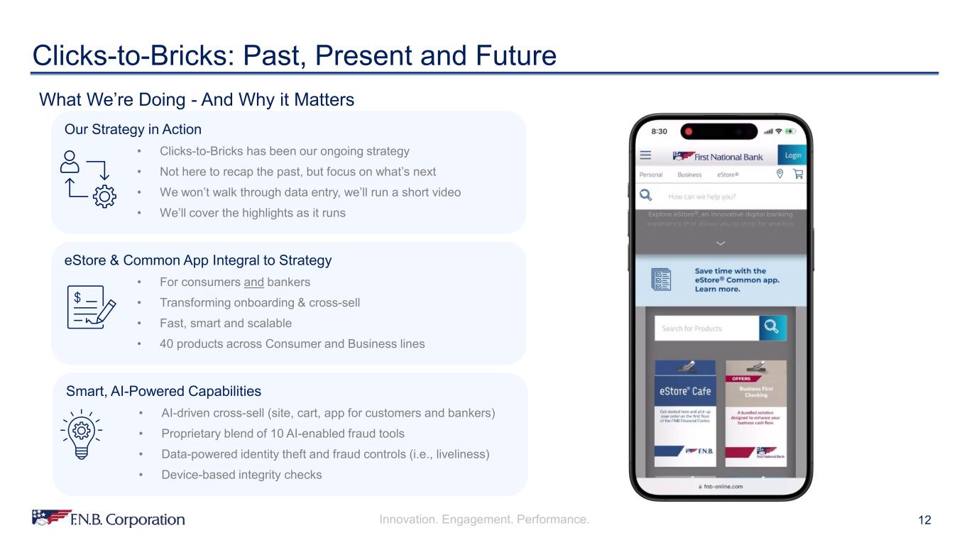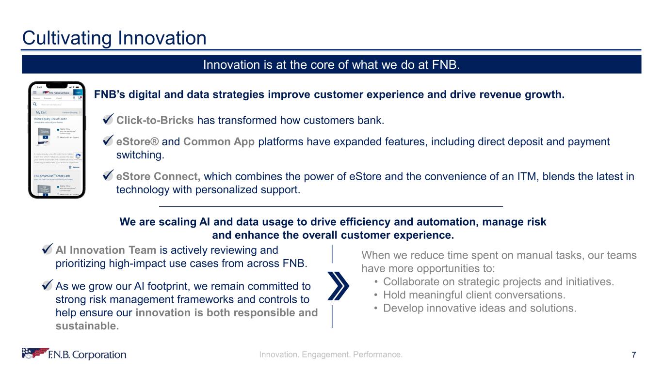 Innovation. Engagement. Performance. 7 Cultivating Innovation Innovation is at the core of what we do at FNB. FNB’s digital and data strategies improve customer experience and drive revenue growth. Click-to-Bricks has transformed how customers bank. eStore® and Common App platforms have expanded features, including direct deposit and payment switching. eStore Connect, which combines the power of eStore and the convenience of an ITM, blends the latest in technology with personalized support. When we reduce time spent on manual tasks, our teams have more opportunities to: • Collaborate on strategic projects and initiatives. • Hold meaningful client conversations. • Develop innovative ideas and solutions. We are scaling AI and data usage to drive efficiency and automation, manage risk and enhance the overall customer experience. AI Innovation Team is actively reviewing and prioritizing high-impact use cases from across FNB. As we grow our AI footprint, we remain committed to strong risk management frameworks and controls to help ensure our innovation is both responsible and sustainable.