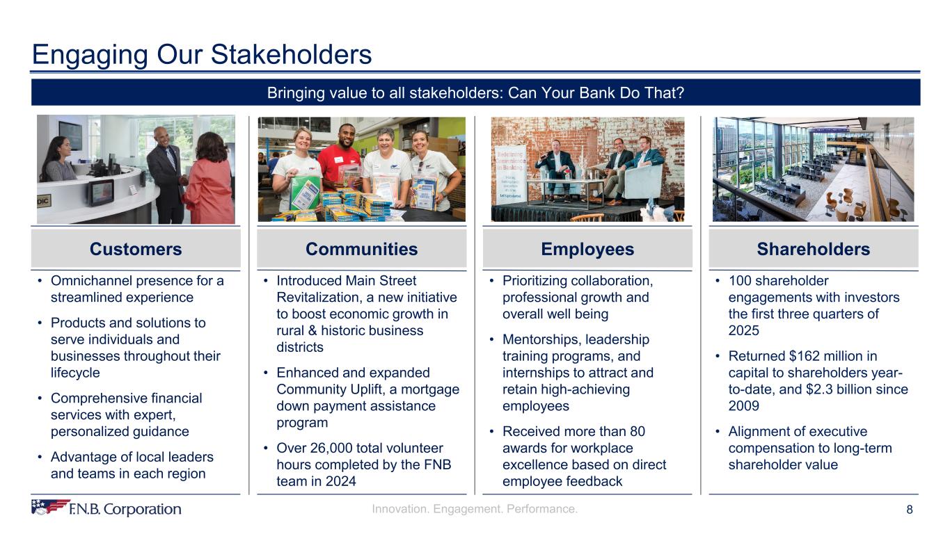 Innovation. Engagement. Performance. 2 Cautionary Statement Regarding Forward-Looking Information This document contains “forward-looking statements” within the meaning of the Private Securities Litigation Reform Act of 1995. Forward-looking statements are those that do not relate to historical facts and that are based on current assumptions, beliefs, estimates, expectations and projections, many of which, by their nature, are inherently uncertain and beyond our control. Forward-looking statements may relate to various matters, including our financial condition, results of operations, plans, objectives, future performance, business or industry, and usually can be identified by the use of forward-looking words, such as “anticipates,” “assumes,” “believes,” “can,” “continues,” “could,” ”enable,” “estimates,” “expects,” “forecasts,” “goal,” “intends,” “likely,” “may,” “might,” “objective,” “plans,” “positioned,” “potential,” “projects,” “remains,” “should,” “target,” “trend,” “will,” “would,” or similar words or expressions or variations thereof, and the negative thereof, but these terms are not the exclusive means of identifying such statements. You should not place undue reliance on forward-looking statements, as they are subject to risks and uncertainties, including, but not limited to, those described below. When considering these forward- looking statements, you should keep in mind these risks and uncertainties, as well as any cautionary statements we may make. There are various important factors that could cause future results to differ materially from historical performance and any forward-looking statements. Factors that might cause such differences, include, but are not limited to: • the credit risk associated with the substantial amount of commercial loans and leases in our loan portfolio; • the volatility of the mortgage banking business; • changes in market interest rates, the U.S. federal government shutdown and the unpredictability of monetary, tax and other policies of government agencies, including tariffs or the imposition of new tariffs, trade wars, barriers or restrictions, or threats of such actions; • the impact of changes in interest rates on the value of our investment securities portfolios; • changes in our ability to obtain liquidity as and when needed to fund our obligations as they come due, including as a result of adverse changes to our credit ratings; • the risk associated with uninsured deposit account balances; • regulatory limits on our ability to receive dividends from our subsidiaries and pay dividends to our shareholders; • our ability to recruit and retain qualified banking professionals; • the financial soundness of other financial institutions and the impact of volatility in the banking sector on us; • changes and instability in economic conditions and financial markets, in the regions in which we operate or otherwise, including a contraction of economic activity, economic downturn or uncertainty and international conflict; • our ability to continue to invest in technological improvements as they become appropriate or necessary; • any interruption in or breach in security of our information systems, or other cybersecurity risks; • risks associated with reliance on third-party vendors and artificial intelligence; • risks associated with the use of models, estimations and assumptions in our business; • the effects of adverse weather events and public health emergencies; • the risks associated with acquiring other banks and financial services businesses, including integration into our existing operations; • the extensive federal and state regulations, supervision and examination governing almost every aspect of our operations, and potential expenses associated with complying with such regulations; • our ability to comply with the consent orders entered into by First National Bank of Pennsylvania with the Department of Justice and the North Carolina State Department of Justice, and related costs and potential reputational harm; • changes in federal, state or local tax rules and regulations or interpretations, or accounting policies, standards and interpretations; • the effects of climate change and related legislative and regulatory initiatives; and • any reputation, credit, interest rate, market, operational, litigation, legal, liquidity, regulatory and compliance risk resulting from developments related to any of the risks discussed above. FNB cautions that the risks identified here are not exhaustive of the types of risks that may adversely impact FNB and actual results may differ materially from those expressed or implied as a result of these risks and uncertainties, including, but not limited to, the risk factors and other uncertainties described under Item 1A. Risk Factors and the Risk Management sections of our 2024 Annual Report on Form 10-K (including the MD&A section), our subsequent 2025 Quarterly Reports on Form 10-Q (including the risk factors and risk management discussions) and our other 2025 filings with the Securities and Exchange Commission (SEC), which are available on our corporate website at https://www.fnb-online.com/about-us/investor- information/reports-and-filings or the SEC’s website at www.sec.gov. We have included our web address as an inactive textual reference only. Information on our website is not part of our SEC filings. You should treat forward-looking statements as speaking only as of the date they are made and based only on information then actually known to FNB. FNB does not undertake, and specifically disclaim any obligation to update or revise any forward-looking statements to reflect the occurrence of events or circumstances after the date of such statements except as required by law.