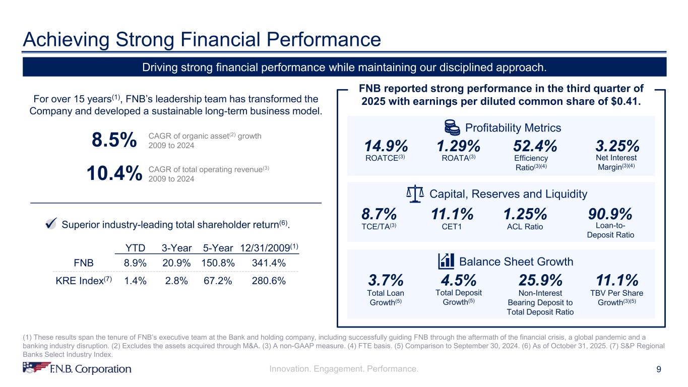 Innovation. Engagement. Performance. 8 Engaging Our Stakeholders Bringing value to all stakeholders: Can Your Bank Do That? • Omnichannel presence for a streamlined experience • Products and solutions to serve individuals and businesses throughout their lifecycle • Comprehensive financial services with expert, personalized guidance • Advantage of local leaders and teams in each region Customers • Prioritizing collaboration, professional growth and overall well being • Mentorships, leadership training programs, and internships to attract and retain high-achieving employees • Received more than 80 awards for workplace excellence based on direct employee feedback Employees • Introduced Main Street Revitalization, a new initiative to boost economic growth in rural & historic business districts • Enhanced and expanded Community Uplift, a mortgage down payment assistance program • Over 26,000 total volunteer hours completed by the FNB team in 2024 Communities • 100 shareholder engagements with investors the first three quarters of 2025 • Returned $162 million in capital to shareholders year- to-date, and $2.3 billion since 2009 • Alignment of executive compensation to long-term shareholder value Shareholders