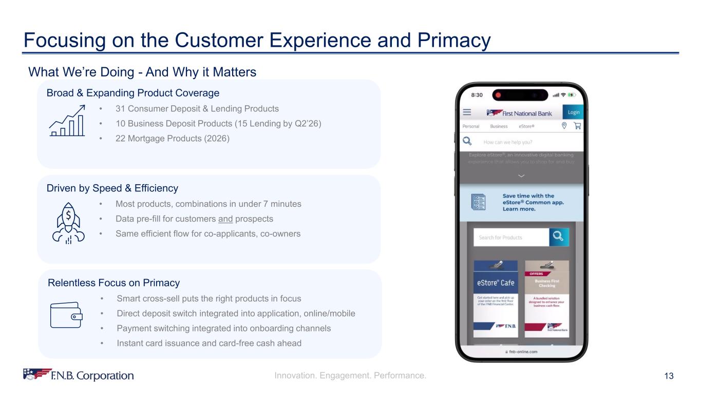 Innovation. Engagement. Performance. 12 Clicks-to-Bricks: Past, Present and Future eStore & Common App Integral to Strategy • For consumers and bankers • Transforming onboarding & cross-sell • Fast, smart and scalable • 40 products across Consumer and Business lines Smart, AI-Powered Capabilities • AI-driven cross-sell (site, cart, app for customers and bankers) • Proprietary blend of 10 AI-enabled fraud tools • Data-powered identity theft and fraud controls (i.e., liveliness) • Device-based integrity checks Our Strategy in Action • Clicks-to-Bricks has been our ongoing strategy • Not here to recap the past, but focus on what’s next • We won’t walk through data entry, we’ll run a short video • We’ll cover the highlights as it runs What We’re Doing - And Why it Matters