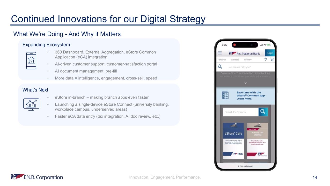 Innovation. Engagement. Performance. Broad & Expanding Product Coverage • 31 Consumer Deposit & Lending Products • 10 Business Deposit Products (15 Lending by Q2’26) • 22 Mortgage Products (2026) 13 Focusing on the Customer Experience and Primacy Driven by Speed & Efficiency • Most products, combinations in under 7 minutes • Data pre-fill for customers and prospects • Same efficient flow for co-applicants, co-owners Relentless Focus on Primacy • Smart cross-sell puts the right products in focus • Direct deposit switch integrated into application, online/mobile • Payment switching integrated into onboarding channels • Instant card issuance and card-free cash ahead What We’re Doing - And Why it Matters