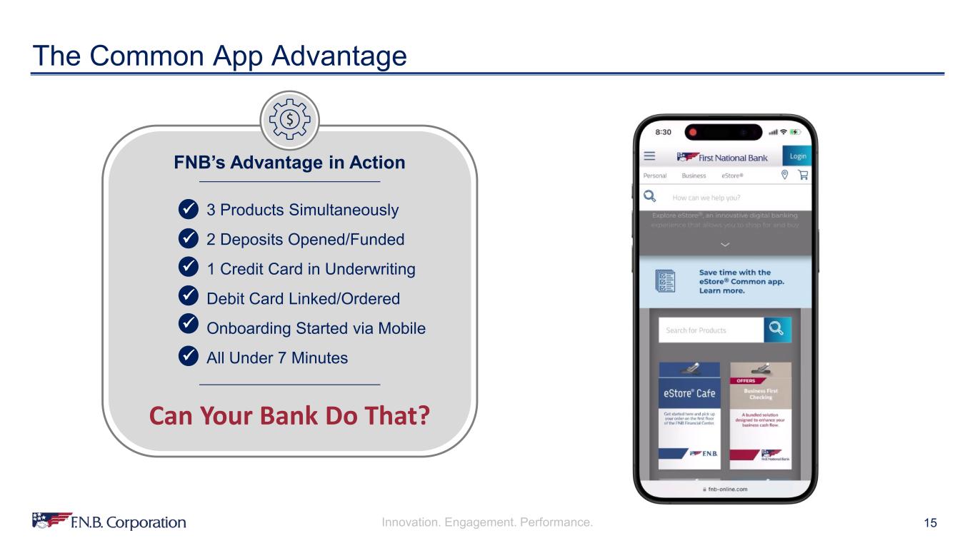 Innovation. Engagement. Performance. 15 The Common App Advantage 1 FNB’s Advantage in Action 3 Products Simultaneously 2 Deposits Opened/Funded 1 Credit Card in Underwriting Debit Card Linked/Ordered Onboarding Started via Mobile All Under 7 Minutes Can Your Bank Do That?