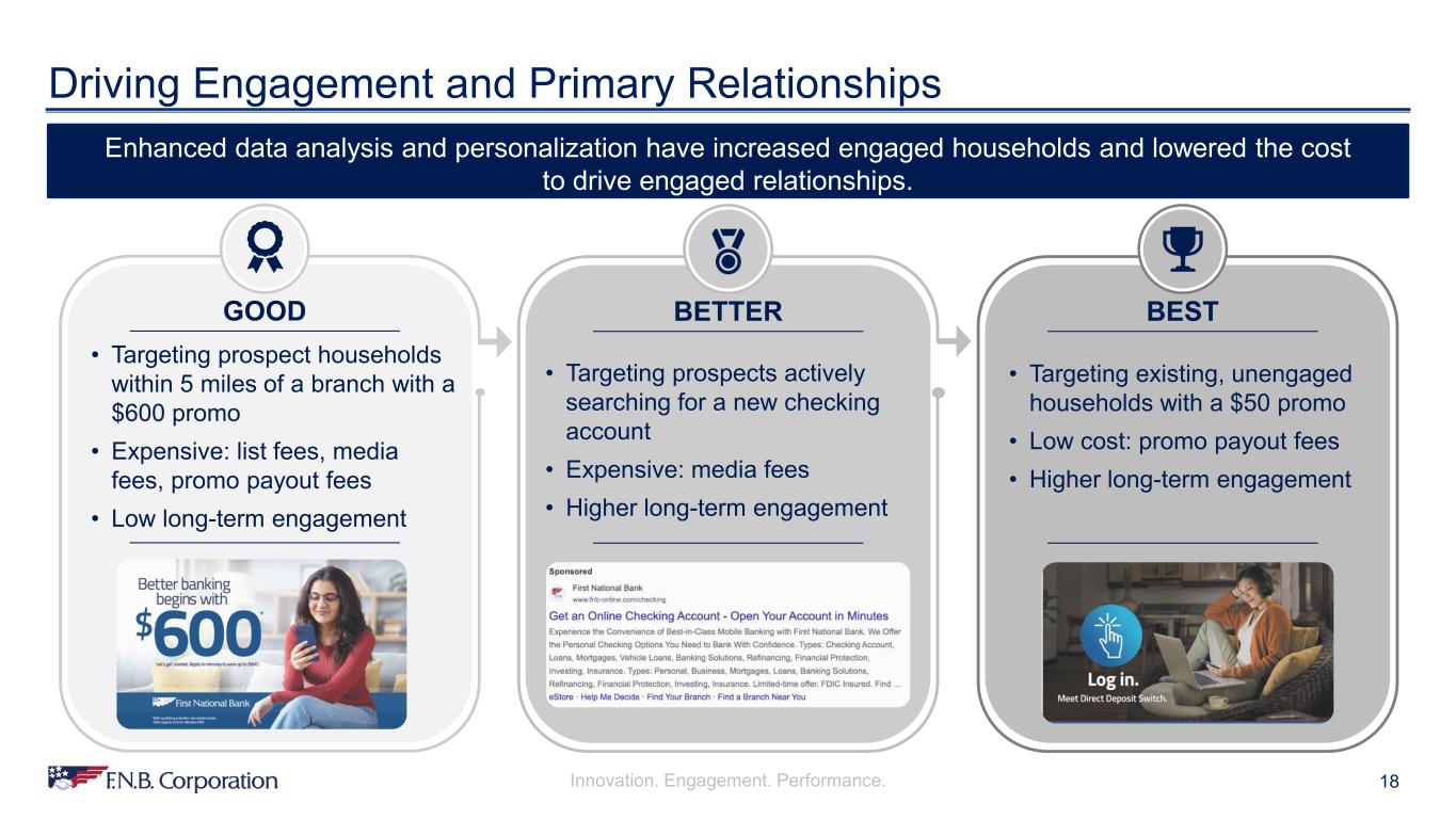 Innovation. Engagement. Performance. 17 Impact of Customer Engagement ~70% of FNB’s Consumer Households are engaged For engaged deposit-first(1) households compared to unengaged households A household with a checking account with the following criteria: • at least 1 debit • at least 1 credit • 8 consumer-initiated transactions in one of the last three months with FNB Engaged Household 3x Higher Consumer Loan Cross Sell 8x Higher Median Deposit Balance For engaged households compared to unengaged households Consumer Deposit Balances(2) (1) Represents households whose first consumer product purchase was a FNB deposit product. (2) Data as of 3Q25. $32,196 $4,925 $22,978 $594 Average Deposit Balance Median Deposit Balance Engaged Unengaged Customer engagement drives customer balances, future cross sell and customer lifetime value.