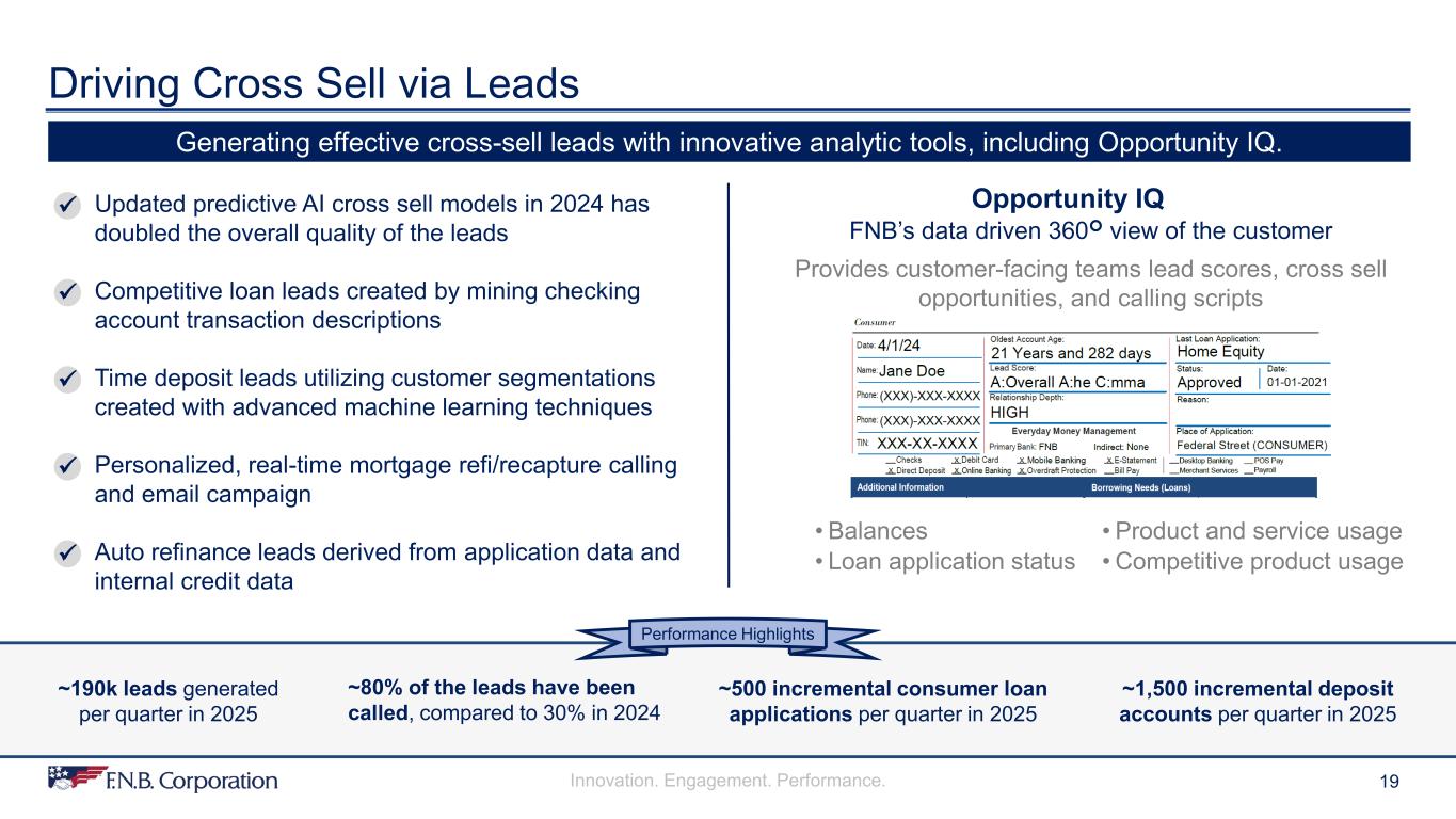 Innovation. Engagement. Performance. 19 Driving Cross Sell via Leads Generating effective cross-sell leads with innovative analytic tools, including Opportunity IQ. Performance Highlights ~190k leads generated per quarter in 2025 ~80% of the leads have been called, compared to 30% in 2024 ~500 incremental consumer loan applications per quarter in 2025 ~1,500 incremental deposit accounts per quarter in 2025 Opportunity IQ • Balances Updated predictive AI cross sell models in 2024 has doubled the overall quality of the leads Competitive loan leads created by mining checking account transaction descriptions Time deposit leads utilizing customer segmentations created with advanced machine learning techniques Personalized, real-time mortgage refi/recapture calling and email campaign Auto refinance leads derived from application data and internal credit data • Loan application status • Competitive product usage • Product and service usage FNB’s data driven 360 view of the customer Provides customer-facing teams lead scores, cross sell opportunities, and calling scripts