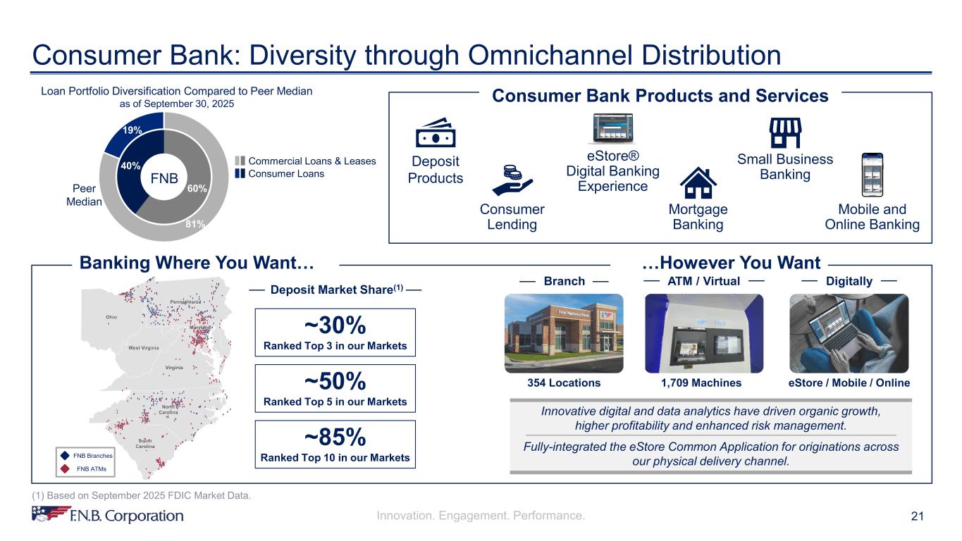 Innovation. Engagement. Performance. 2 Cautionary Statement Regarding Forward-Looking Information This document contains “forward-looking statements” within the meaning of the Private Securities Litigation Reform Act of 1995. Forward-looking statements are those that do not relate to historical facts and that are based on current assumptions, beliefs, estimates, expectations and projections, many of which, by their nature, are inherently uncertain and beyond our control. Forward-looking statements may relate to various matters, including our financial condition, results of operations, plans, objectives, future performance, business or industry, and usually can be identified by the use of forward-looking words, such as “anticipates,” “assumes,” “believes,” “can,” “continues,” “could,” ”enable,” “estimates,” “expects,” “forecasts,” “goal,” “intends,” “likely,” “may,” “might,” “objective,” “plans,” “positioned,” “potential,” “projects,” “remains,” “should,” “target,” “trend,” “will,” “would,” or similar words or expressions or variations thereof, and the negative thereof, but these terms are not the exclusive means of identifying such statements. You should not place undue reliance on forward-looking statements, as they are subject to risks and uncertainties, including, but not limited to, those described below. When considering these forward- looking statements, you should keep in mind these risks and uncertainties, as well as any cautionary statements we may make. There are various important factors that could cause future results to differ materially from historical performance and any forward-looking statements. Factors that might cause such differences, include, but are not limited to: • the credit risk associated with the substantial amount of commercial loans and leases in our loan portfolio; • the volatility of the mortgage banking business; • changes in market interest rates, the U.S. federal government shutdown and the unpredictability of monetary, tax and other policies of government agencies, including tariffs or the imposition of new tariffs, trade wars, barriers or restrictions, or threats of such actions; • the impact of changes in interest rates on the value of our investment securities portfolios; • changes in our ability to obtain liquidity as and when needed to fund our obligations as they come due, including as a result of adverse changes to our credit ratings; • the risk associated with uninsured deposit account balances; • regulatory limits on our ability to receive dividends from our subsidiaries and pay dividends to our shareholders; • our ability to recruit and retain qualified banking professionals; • the financial soundness of other financial institutions and the impact of volatility in the banking sector on us; • changes and instability in economic conditions and financial markets, in the regions in which we operate or otherwise, including a contraction of economic activity, economic downturn or uncertainty and international conflict; • our ability to continue to invest in technological improvements as they become appropriate or necessary; • any interruption in or breach in security of our information systems, or other cybersecurity risks; • risks associated with reliance on third-party vendors and artificial intelligence; • risks associated with the use of models, estimations and assumptions in our business; • the effects of adverse weather events and public health emergencies; • the risks associated with acquiring other banks and financial services businesses, including integration into our existing operations; • the extensive federal and state regulations, supervision and examination governing almost every aspect of our operations, and potential expenses associated with complying with such regulations; • our ability to comply with the consent orders entered into by First National Bank of Pennsylvania with the Department of Justice and the North Carolina State Department of Justice, and related costs and potential reputational harm; • changes in federal, state or local tax rules and regulations or interpretations, or accounting policies, standards and interpretations; • the effects of climate change and related legislative and regulatory initiatives; and • any reputation, credit, interest rate, market, operational, litigation, legal, liquidity, regulatory and compliance risk resulting from developments related to any of the risks discussed above. FNB cautions that the risks identified here are not exhaustive of the types of risks that may adversely impact FNB and actual results may differ materially from those expressed or implied as a result of these risks and uncertainties, including, but not limited to, the risk factors and other uncertainties described under Item 1A. Risk Factors and the Risk Management sections of our 2024 Annual Report on Form 10-K (including the MD&A section), our subsequent 2025 Quarterly Reports on Form 10-Q (including the risk factors and risk management discussions) and our other 2025 filings with the Securities and Exchange Commission (SEC), which are available on our corporate website at https://www.fnb-online.com/about-us/investor- information/reports-and-filings or the SEC’s website at www.sec.gov. We have included our web address as an inactive textual reference only. Information on our website is not part of our SEC filings. You should treat forward-looking statements as speaking only as of the date they are made and based only on information then actually known to FNB. FNB does not undertake, and specifically disclaim any obligation to update or revise any forward-looking statements to reflect the occurrence of events or circumstances after the date of such statements except as required by law.