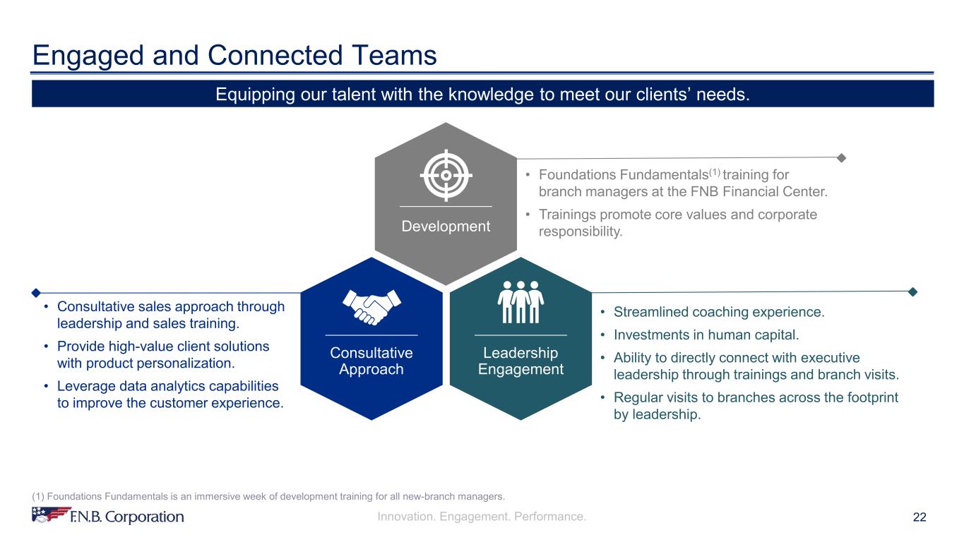 Innovation. Engagement. Performance. Consultative Approach 22 Engaged and Connected Teams Equipping our talent with the knowledge to meet our clients’ needs. • Consultative sales approach through leadership and sales training. • Provide high-value client solutions with product personalization. • Leverage data analytics capabilities to improve the customer experience. • Streamlined coaching experience. • Investments in human capital. • Ability to directly connect with executive leadership through trainings and branch visits. • Regular visits to branches across the footprint by leadership. • Foundations Fundamentals(1) training for branch managers at the FNB Financial Center. • Trainings promote core values and corporate responsibility. (1) Foundations Fundamentals is an immersive week of development training for all new-branch managers. Development Leadership Engagement