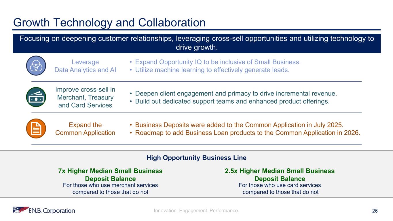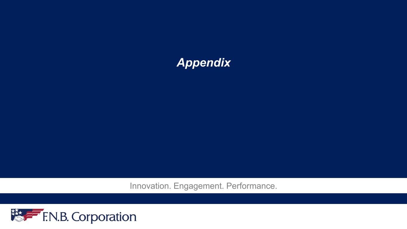 Innovation. Engagement. Performance. 25 FNB Small Business: Positioned for Future Growth Small Business is positioned to improve household penetration and customer engagement. ~90,000 FNB Small Business Customers ~2.7 million Small Businesses(1) across FNB’s footprint Significant Opportunity to Grow Small Business Households Small Business deposits are 3x loan balances, providing a low-cost net funding source for the Bank. Business Checking Business Savings and Money Market Lines of Credit Term Loans Commercial Real Estate Loans Equipment Financing SBA Loans Business Credit Cards Treasury Management Merchant Services A comprehensive suite of products and services to meet our customer needs. Product Offerings (1) Represents businesses with revenue between $100K and $10 million.