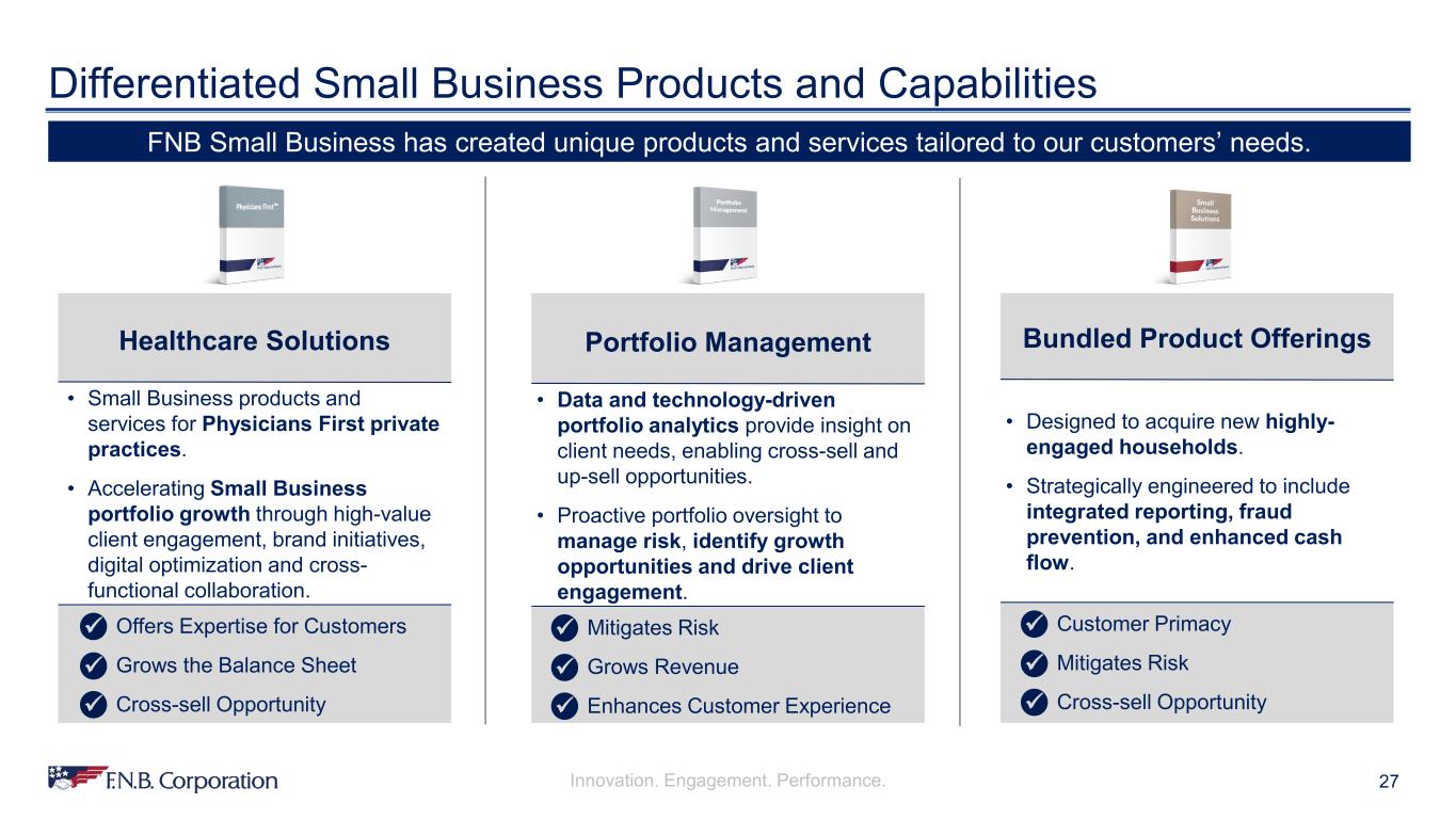 Innovation. Engagement. Performance. 26 Growth Technology and Collaboration Improve cross-sell in Merchant, Treasury and Card Services • Deepen client engagement and primacy to drive incremental revenue. • Build out dedicated support teams and enhanced product offerings. Expand the Common Application • Business Deposits were added to the Common Application in July 2025. • Roadmap to add Business Loan products to the Common Application in 2026. Leverage Data Analytics and AI • Expand Opportunity IQ to be inclusive of Small Business. • Utilize machine learning to effectively generate leads. Focusing on deepening customer relationships, leveraging cross-sell opportunities and utilizing technology to drive growth. 2.5x Higher Median Small Business Deposit Balance For those who use card services compared to those that do not 7x Higher Median Small Business Deposit Balance For those who use merchant services compared to those that do not High Opportunity Business Line