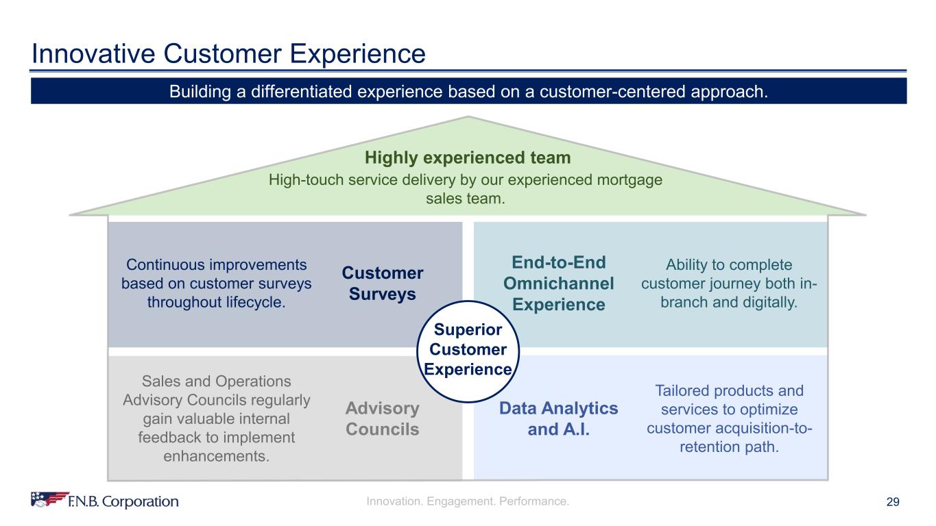 Innovation. Engagement. Performance. 28 Engaging Customer Relationships Customer-focused and deeply rooted in FNB consumer bank Focused on acquiring, servicing, and expanding households Collaboration across FNB teams Increased cross-sell opportunities with relationship-based pricing Leverage customer-facing technology, including Direct Deposit Switch Over 90% of retail mortgage customers have at least one additional FNB product. 85% of mortgage customers are new to FNB at time of origination. Total Residential Mortgage Servicing and Portfolio Balances have doubled every 5 years since 2015. Portfolio BalancesSalable/Servicing Balances Residential Mortgage Servicing & Portfolio Balances(1) ($ amount in billions) 100% 34% 43% 44% 51% 54% 56% 56% 66% 57% 56% 49% 46% 44% 44% $1.1 $4.1 $8.1 $8.8 $10.7 $12.6 $14.7 $16.0 2012 2015 2020 2021 2022 2023 2024 3Q25 FNB Mortgage Banking has been a growth engine for new household acquisitions. 3.7x 2.0x 2.0x (1) FNB began to build the servicing portfolio in 2012.