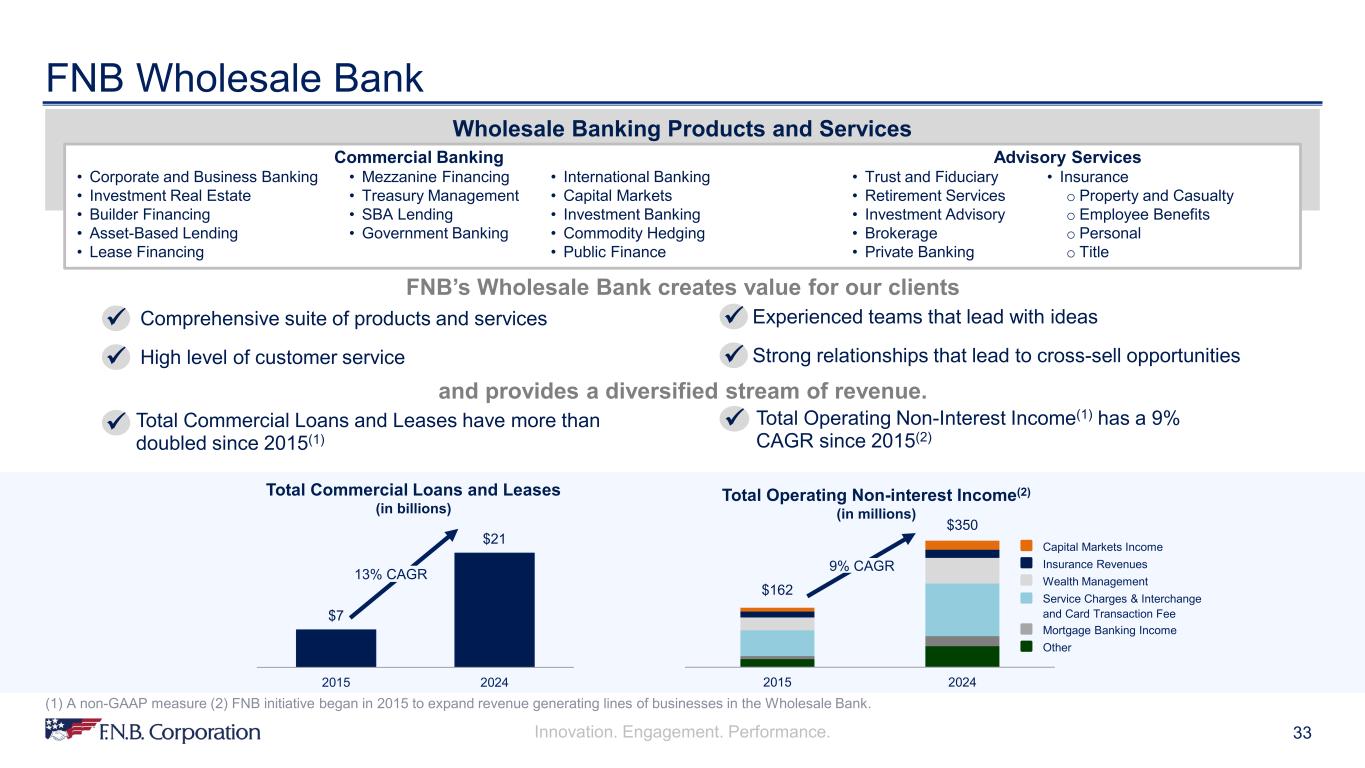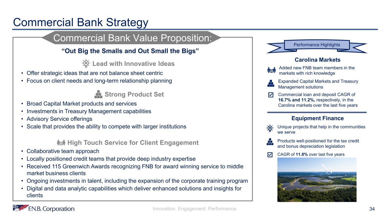 Innovation. Engagement. Performance. 33 FNB Wholesale Bank Wholesale Banking Products and Services Commercial Banking Advisory Services • Corporate and Business Banking • Mezzanine Financing • International Banking • Trust and Fiduciary • Insurance • Investment Real Estate • Treasury Management • Capital Markets • Retirement Services o Property and Casualty • Builder Financing • SBA Lending • Investment Banking • Investment Advisory o Employee Benefits • Asset-Based Lending • Government Banking • Commodity Hedging • Brokerage o Personal • Lease Financing • Public Finance • Private Banking o Title FNB’s Wholesale Bank creates value for our clients and provides a diversified stream of revenue. Total Commercial Loans and Leases (in billions) $7 $21 2015 2024 13% CAGR $162 $350 2015 2024 9% CAGR Total Operating Non-interest Income(2) (in millions) Capital Markets Income Insurance Revenues Wealth Management Service Charges & Interchange and Card Transaction Fee Mortgage Banking Income Other Comprehensive suite of products and services Experienced teams that lead with ideas High level of customer service Strong relationships that lead to cross-sell opportunities Total Operating Non-Interest Income(1) has a 9% CAGR since 2015(2) Total Commercial Loans and Leases have more than doubled since 2015(1) (1) A non-GAAP measure (2) FNB initiative began in 2015 to expand revenue generating lines of businesses in the Wholesale Bank.