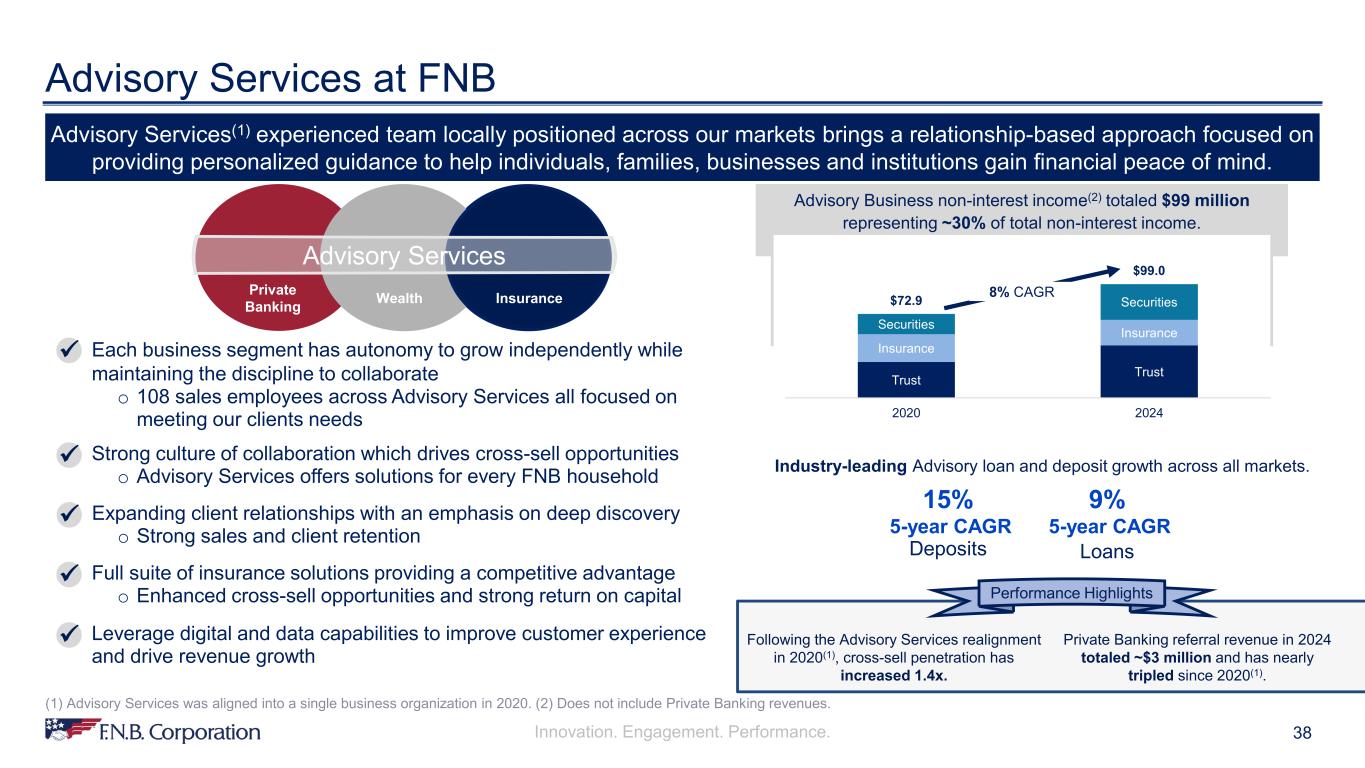 Innovation. Engagement. Performance. 2 Cautionary Statement Regarding Forward-Looking Information This document contains “forward-looking statements” within the meaning of the Private Securities Litigation Reform Act of 1995. Forward-looking statements are those that do not relate to historical facts and that are based on current assumptions, beliefs, estimates, expectations and projections, many of which, by their nature, are inherently uncertain and beyond our control. Forward-looking statements may relate to various matters, including our financial condition, results of operations, plans, objectives, future performance, business or industry, and usually can be identified by the use of forward-looking words, such as “anticipates,” “assumes,” “believes,” “can,” “continues,” “could,” ”enable,” “estimates,” “expects,” “forecasts,” “goal,” “intends,” “likely,” “may,” “might,” “objective,” “plans,” “positioned,” “potential,” “projects,” “remains,” “should,” “target,” “trend,” “will,” “would,” or similar words or expressions or variations thereof, and the negative thereof, but these terms are not the exclusive means of identifying such statements. You should not place undue reliance on forward-looking statements, as they are subject to risks and uncertainties, including, but not limited to, those described below. When considering these forward- looking statements, you should keep in mind these risks and uncertainties, as well as any cautionary statements we may make. There are various important factors that could cause future results to differ materially from historical performance and any forward-looking statements. Factors that might cause such differences, include, but are not limited to: • the credit risk associated with the substantial amount of commercial loans and leases in our loan portfolio; • the volatility of the mortgage banking business; • changes in market interest rates, the U.S. federal government shutdown and the unpredictability of monetary, tax and other policies of government agencies, including tariffs or the imposition of new tariffs, trade wars, barriers or restrictions, or threats of such actions; • the impact of changes in interest rates on the value of our investment securities portfolios; • changes in our ability to obtain liquidity as and when needed to fund our obligations as they come due, including as a result of adverse changes to our credit ratings; • the risk associated with uninsured deposit account balances; • regulatory limits on our ability to receive dividends from our subsidiaries and pay dividends to our shareholders; • our ability to recruit and retain qualified banking professionals; • the financial soundness of other financial institutions and the impact of volatility in the banking sector on us; • changes and instability in economic conditions and financial markets, in the regions in which we operate or otherwise, including a contraction of economic activity, economic downturn or uncertainty and international conflict; • our ability to continue to invest in technological improvements as they become appropriate or necessary; • any interruption in or breach in security of our information systems, or other cybersecurity risks; • risks associated with reliance on third-party vendors and artificial intelligence; • risks associated with the use of models, estimations and assumptions in our business; • the effects of adverse weather events and public health emergencies; • the risks associated with acquiring other banks and financial services businesses, including integration into our existing operations; • the extensive federal and state regulations, supervision and examination governing almost every aspect of our operations, and potential expenses associated with complying with such regulations; • our ability to comply with the consent orders entered into by First National Bank of Pennsylvania with the Department of Justice and the North Carolina State Department of Justice, and related costs and potential reputational harm; • changes in federal, state or local tax rules and regulations or interpretations, or accounting policies, standards and interpretations; • the effects of climate change and related legislative and regulatory initiatives; and • any reputation, credit, interest rate, market, operational, litigation, legal, liquidity, regulatory and compliance risk resulting from developments related to any of the risks discussed above. FNB cautions that the risks identified here are not exhaustive of the types of risks that may adversely impact FNB and actual results may differ materially from those expressed or implied as a result of these risks and uncertainties, including, but not limited to, the risk factors and other uncertainties described under Item 1A. Risk Factors and the Risk Management sections of our 2024 Annual Report on Form 10-K (including the MD&A section), our subsequent 2025 Quarterly Reports on Form 10-Q (including the risk factors and risk management discussions) and our other 2025 filings with the Securities and Exchange Commission (SEC), which are available on our corporate website at https://www.fnb-online.com/about-us/investor- information/reports-and-filings or the SEC’s website at www.sec.gov. We have included our web address as an inactive textual reference only. Information on our website is not part of our SEC filings. You should treat forward-looking statements as speaking only as of the date they are made and based only on information then actually known to FNB. FNB does not undertake, and specifically disclaim any obligation to update or revise any forward-looking statements to reflect the occurrence of events or circumstances after the date of such statements except as required by law.