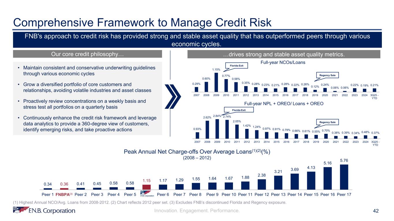 Innovation. Engagement. Performance. 0.34 0.36 0.41 0.45 0.58 0.58 1.15 1.17 1.29 1.55 1.64 1.67 1.88 2.38 3.21 3.69 4.13 5.16 5.76 Peer 1 Peer 2 Peer 3 Peer 4 Peer 5 Peer 6 Peer 7 Peer 8 Peer 9 Peer 10 Peer 11 Peer 12 Peer 13 Peer 14 Peer 15 Peer 16 Peer 17FNBPA(3) 42 Comprehensive Framework to Manage Credit Risk FNB's approach to credit risk has provided strong and stable asset quality that has outperformed peers through various economic cycles. Our core credit philosophy… • Maintain consistent and conservative underwriting guidelines through various economic cycles • Grow a diversified portfolio of core customers and relationships, avoiding volatile industries and asset classes • Proactively review concentrations on a weekly basis and stress test all portfolios on a quarterly basis • Continuously enhance the credit risk framework and leverage data analytics to provide a 360-degree view of customers, identify emerging risks, and take proactive actions Peak Annual Net Charge-offs Over Average Loans(1)(2)(%) (2008 – 2012) (1) Highest Annual NCO/Avg. Loans from 2008-2012. (2) Chart reflects 2012 peer set. (3) Excludes FNB’s discontinued Florida and Regency exposure. …drives strong and stable asset quality metrics. 0.29% 0.60% 1.15% 0.77% 0.58% 0.35% 0.28% 0.23% 0.21% 0.28% 0.22% 0.26% 0.12% 0.24% 0.06% 0.06% 0.22% 0.19% 0.21% 2007 2008 2009 2010 2011 2012 2013 2014 2015 2016 2017 2018 2019 2020 2021 2022 2023 2024 3Q25 - YTD 0.93% 2.62% 2.84% 2.74% 2.05% 1.42% 1.24% 0.97% 0.91% 0.79% 0.66% 0.61% 0.55% 0.70% 0.38% 0.39% 0.34% 0.48% 0.37% 2007 2008 2009 2010 2011 2012 2013 2014 2015 2016 2017 2018 2019 2020 2021 2022 2023 2024 3Q25 - YTD Florida Exit Regency Sale Regency Sale Florida Exit Full-year NCOs/Loans Full-year NPL + OREO/ Loans + OREO