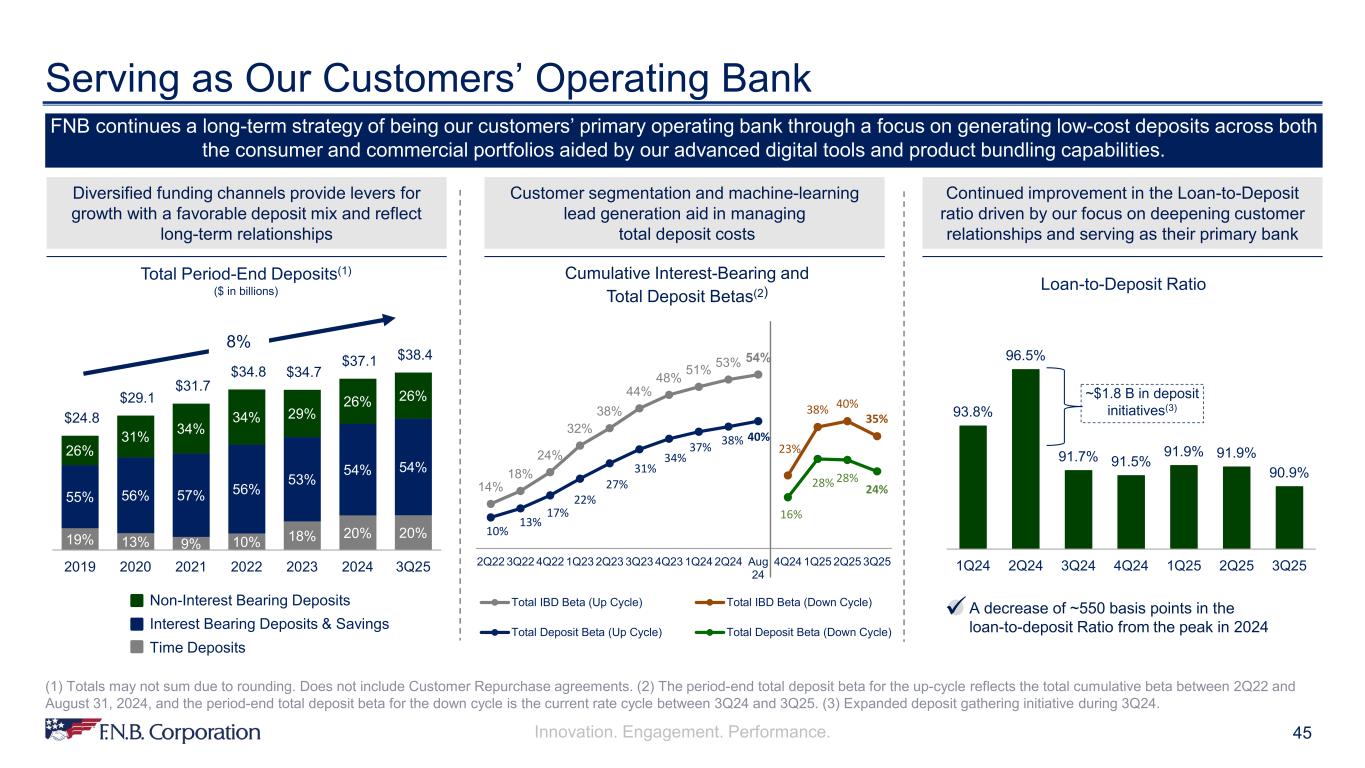 Innovation. Engagement. Performance. 2 Cautionary Statement Regarding Forward-Looking Information This document contains “forward-looking statements” within the meaning of the Private Securities Litigation Reform Act of 1995. Forward-looking statements are those that do not relate to historical facts and that are based on current assumptions, beliefs, estimates, expectations and projections, many of which, by their nature, are inherently uncertain and beyond our control. Forward-looking statements may relate to various matters, including our financial condition, results of operations, plans, objectives, future performance, business or industry, and usually can be identified by the use of forward-looking words, such as “anticipates,” “assumes,” “believes,” “can,” “continues,” “could,” ”enable,” “estimates,” “expects,” “forecasts,” “goal,” “intends,” “likely,” “may,” “might,” “objective,” “plans,” “positioned,” “potential,” “projects,” “remains,” “should,” “target,” “trend,” “will,” “would,” or similar words or expressions or variations thereof, and the negative thereof, but these terms are not the exclusive means of identifying such statements. You should not place undue reliance on forward-looking statements, as they are subject to risks and uncertainties, including, but not limited to, those described below. When considering these forward- looking statements, you should keep in mind these risks and uncertainties, as well as any cautionary statements we may make. There are various important factors that could cause future results to differ materially from historical performance and any forward-looking statements. Factors that might cause such differences, include, but are not limited to: • the credit risk associated with the substantial amount of commercial loans and leases in our loan portfolio; • the volatility of the mortgage banking business; • changes in market interest rates, the U.S. federal government shutdown and the unpredictability of monetary, tax and other policies of government agencies, including tariffs or the imposition of new tariffs, trade wars, barriers or restrictions, or threats of such actions; • the impact of changes in interest rates on the value of our investment securities portfolios; • changes in our ability to obtain liquidity as and when needed to fund our obligations as they come due, including as a result of adverse changes to our credit ratings; • the risk associated with uninsured deposit account balances; • regulatory limits on our ability to receive dividends from our subsidiaries and pay dividends to our shareholders; • our ability to recruit and retain qualified banking professionals; • the financial soundness of other financial institutions and the impact of volatility in the banking sector on us; • changes and instability in economic conditions and financial markets, in the regions in which we operate or otherwise, including a contraction of economic activity, economic downturn or uncertainty and international conflict; • our ability to continue to invest in technological improvements as they become appropriate or necessary; • any interruption in or breach in security of our information systems, or other cybersecurity risks; • risks associated with reliance on third-party vendors and artificial intelligence; • risks associated with the use of models, estimations and assumptions in our business; • the effects of adverse weather events and public health emergencies; • the risks associated with acquiring other banks and financial services businesses, including integration into our existing operations; • the extensive federal and state regulations, supervision and examination governing almost every aspect of our operations, and potential expenses associated with complying with such regulations; • our ability to comply with the consent orders entered into by First National Bank of Pennsylvania with the Department of Justice and the North Carolina State Department of Justice, and related costs and potential reputational harm; • changes in federal, state or local tax rules and regulations or interpretations, or accounting policies, standards and interpretations; • the effects of climate change and related legislative and regulatory initiatives; and • any reputation, credit, interest rate, market, operational, litigation, legal, liquidity, regulatory and compliance risk resulting from developments related to any of the risks discussed above. FNB cautions that the risks identified here are not exhaustive of the types of risks that may adversely impact FNB and actual results may differ materially from those expressed or implied as a result of these risks and uncertainties, including, but not limited to, the risk factors and other uncertainties described under Item 1A. Risk Factors and the Risk Management sections of our 2024 Annual Report on Form 10-K (including the MD&A section), our subsequent 2025 Quarterly Reports on Form 10-Q (including the risk factors and risk management discussions) and our other 2025 filings with the Securities and Exchange Commission (SEC), which are available on our corporate website at https://www.fnb-online.com/about-us/investor- information/reports-and-filings or the SEC’s website at www.sec.gov. We have included our web address as an inactive textual reference only. Information on our website is not part of our SEC filings. You should treat forward-looking statements as speaking only as of the date they are made and based only on information then actually known to FNB. FNB does not undertake, and specifically disclaim any obligation to update or revise any forward-looking statements to reflect the occurrence of events or circumstances after the date of such statements except as required by law.