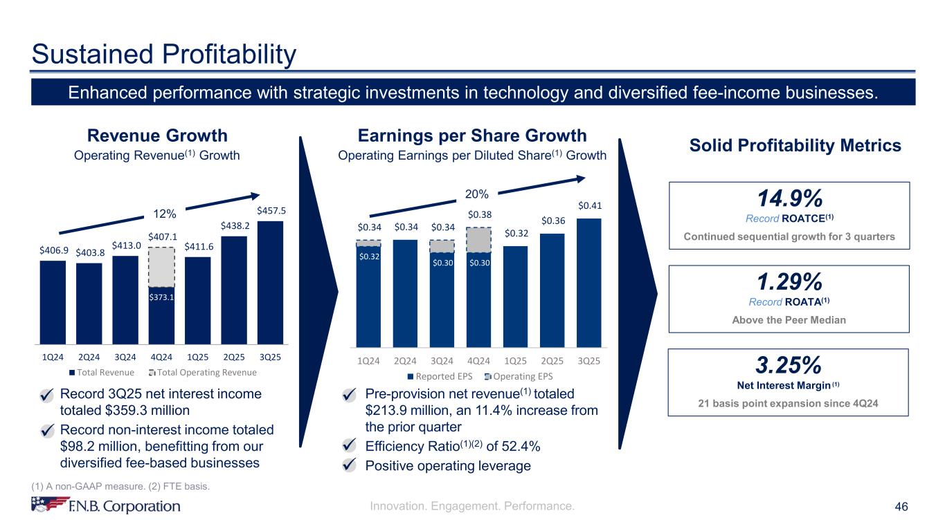Innovation. Engagement. Performance. 2 Cautionary Statement Regarding Forward-Looking Information This document contains “forward-looking statements” within the meaning of the Private Securities Litigation Reform Act of 1995. Forward-looking statements are those that do not relate to historical facts and that are based on current assumptions, beliefs, estimates, expectations and projections, many of which, by their nature, are inherently uncertain and beyond our control. Forward-looking statements may relate to various matters, including our financial condition, results of operations, plans, objectives, future performance, business or industry, and usually can be identified by the use of forward-looking words, such as “anticipates,” “assumes,” “believes,” “can,” “continues,” “could,” ”enable,” “estimates,” “expects,” “forecasts,” “goal,” “intends,” “likely,” “may,” “might,” “objective,” “plans,” “positioned,” “potential,” “projects,” “remains,” “should,” “target,” “trend,” “will,” “would,” or similar words or expressions or variations thereof, and the negative thereof, but these terms are not the exclusive means of identifying such statements. You should not place undue reliance on forward-looking statements, as they are subject to risks and uncertainties, including, but not limited to, those described below. When considering these forward- looking statements, you should keep in mind these risks and uncertainties, as well as any cautionary statements we may make. There are various important factors that could cause future results to differ materially from historical performance and any forward-looking statements. Factors that might cause such differences, include, but are not limited to: • the credit risk associated with the substantial amount of commercial loans and leases in our loan portfolio; • the volatility of the mortgage banking business; • changes in market interest rates, the U.S. federal government shutdown and the unpredictability of monetary, tax and other policies of government agencies, including tariffs or the imposition of new tariffs, trade wars, barriers or restrictions, or threats of such actions; • the impact of changes in interest rates on the value of our investment securities portfolios; • changes in our ability to obtain liquidity as and when needed to fund our obligations as they come due, including as a result of adverse changes to our credit ratings; • the risk associated with uninsured deposit account balances; • regulatory limits on our ability to receive dividends from our subsidiaries and pay dividends to our shareholders; • our ability to recruit and retain qualified banking professionals; • the financial soundness of other financial institutions and the impact of volatility in the banking sector on us; • changes and instability in economic conditions and financial markets, in the regions in which we operate or otherwise, including a contraction of economic activity, economic downturn or uncertainty and international conflict; • our ability to continue to invest in technological improvements as they become appropriate or necessary; • any interruption in or breach in security of our information systems, or other cybersecurity risks; • risks associated with reliance on third-party vendors and artificial intelligence; • risks associated with the use of models, estimations and assumptions in our business; • the effects of adverse weather events and public health emergencies; • the risks associated with acquiring other banks and financial services businesses, including integration into our existing operations; • the extensive federal and state regulations, supervision and examination governing almost every aspect of our operations, and potential expenses associated with complying with such regulations; • our ability to comply with the consent orders entered into by First National Bank of Pennsylvania with the Department of Justice and the North Carolina State Department of Justice, and related costs and potential reputational harm; • changes in federal, state or local tax rules and regulations or interpretations, or accounting policies, standards and interpretations; • the effects of climate change and related legislative and regulatory initiatives; and • any reputation, credit, interest rate, market, operational, litigation, legal, liquidity, regulatory and compliance risk resulting from developments related to any of the risks discussed above. FNB cautions that the risks identified here are not exhaustive of the types of risks that may adversely impact FNB and actual results may differ materially from those expressed or implied as a result of these risks and uncertainties, including, but not limited to, the risk factors and other uncertainties described under Item 1A. Risk Factors and the Risk Management sections of our 2024 Annual Report on Form 10-K (including the MD&A section), our subsequent 2025 Quarterly Reports on Form 10-Q (including the risk factors and risk management discussions) and our other 2025 filings with the Securities and Exchange Commission (SEC), which are available on our corporate website at https://www.fnb-online.com/about-us/investor- information/reports-and-filings or the SEC’s website at www.sec.gov. We have included our web address as an inactive textual reference only. Information on our website is not part of our SEC filings. You should treat forward-looking statements as speaking only as of the date they are made and based only on information then actually known to FNB. FNB does not undertake, and specifically disclaim any obligation to update or revise any forward-looking statements to reflect the occurrence of events or circumstances after the date of such statements except as required by law.