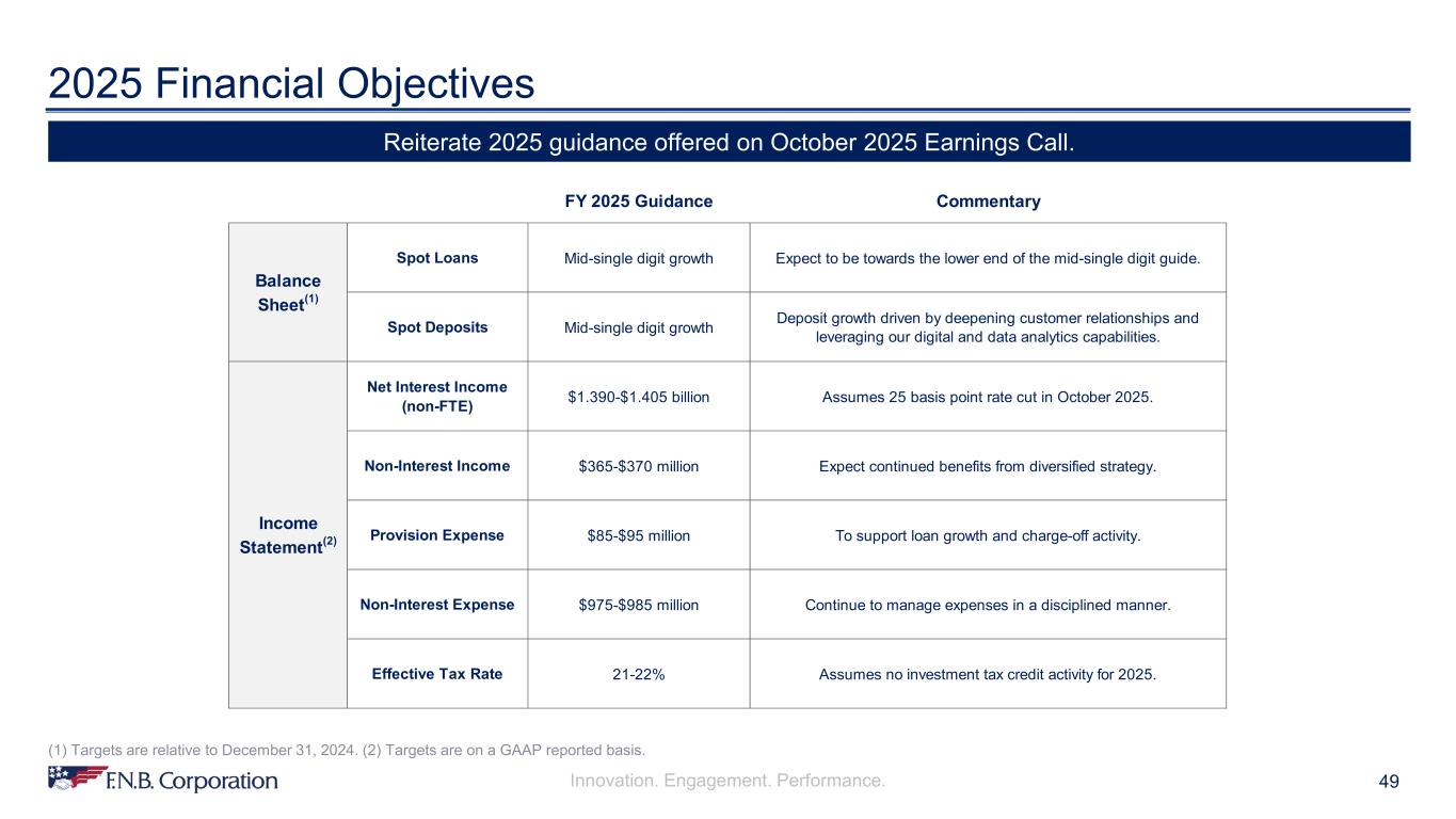 Innovation. Engagement. Performance. 2 Cautionary Statement Regarding Forward-Looking Information This document contains “forward-looking statements” within the meaning of the Private Securities Litigation Reform Act of 1995. Forward-looking statements are those that do not relate to historical facts and that are based on current assumptions, beliefs, estimates, expectations and projections, many of which, by their nature, are inherently uncertain and beyond our control. Forward-looking statements may relate to various matters, including our financial condition, results of operations, plans, objectives, future performance, business or industry, and usually can be identified by the use of forward-looking words, such as “anticipates,” “assumes,” “believes,” “can,” “continues,” “could,” ”enable,” “estimates,” “expects,” “forecasts,” “goal,” “intends,” “likely,” “may,” “might,” “objective,” “plans,” “positioned,” “potential,” “projects,” “remains,” “should,” “target,” “trend,” “will,” “would,” or similar words or expressions or variations thereof, and the negative thereof, but these terms are not the exclusive means of identifying such statements. You should not place undue reliance on forward-looking statements, as they are subject to risks and uncertainties, including, but not limited to, those described below. When considering these forward- looking statements, you should keep in mind these risks and uncertainties, as well as any cautionary statements we may make. There are various important factors that could cause future results to differ materially from historical performance and any forward-looking statements. Factors that might cause such differences, include, but are not limited to: • the credit risk associated with the substantial amount of commercial loans and leases in our loan portfolio; • the volatility of the mortgage banking business; • changes in market interest rates, the U.S. federal government shutdown and the unpredictability of monetary, tax and other policies of government agencies, including tariffs or the imposition of new tariffs, trade wars, barriers or restrictions, or threats of such actions; • the impact of changes in interest rates on the value of our investment securities portfolios; • changes in our ability to obtain liquidity as and when needed to fund our obligations as they come due, including as a result of adverse changes to our credit ratings; • the risk associated with uninsured deposit account balances; • regulatory limits on our ability to receive dividends from our subsidiaries and pay dividends to our shareholders; • our ability to recruit and retain qualified banking professionals; • the financial soundness of other financial institutions and the impact of volatility in the banking sector on us; • changes and instability in economic conditions and financial markets, in the regions in which we operate or otherwise, including a contraction of economic activity, economic downturn or uncertainty and international conflict; • our ability to continue to invest in technological improvements as they become appropriate or necessary; • any interruption in or breach in security of our information systems, or other cybersecurity risks; • risks associated with reliance on third-party vendors and artificial intelligence; • risks associated with the use of models, estimations and assumptions in our business; • the effects of adverse weather events and public health emergencies; • the risks associated with acquiring other banks and financial services businesses, including integration into our existing operations; • the extensive federal and state regulations, supervision and examination governing almost every aspect of our operations, and potential expenses associated with complying with such regulations; • our ability to comply with the consent orders entered into by First National Bank of Pennsylvania with the Department of Justice and the North Carolina State Department of Justice, and related costs and potential reputational harm; • changes in federal, state or local tax rules and regulations or interpretations, or accounting policies, standards and interpretations; • the effects of climate change and related legislative and regulatory initiatives; and • any reputation, credit, interest rate, market, operational, litigation, legal, liquidity, regulatory and compliance risk resulting from developments related to any of the risks discussed above. FNB cautions that the risks identified here are not exhaustive of the types of risks that may adversely impact FNB and actual results may differ materially from those expressed or implied as a result of these risks and uncertainties, including, but not limited to, the risk factors and other uncertainties described under Item 1A. Risk Factors and the Risk Management sections of our 2024 Annual Report on Form 10-K (including the MD&A section), our subsequent 2025 Quarterly Reports on Form 10-Q (including the risk factors and risk management discussions) and our other 2025 filings with the Securities and Exchange Commission (SEC), which are available on our corporate website at https://www.fnb-online.com/about-us/investor- information/reports-and-filings or the SEC’s website at www.sec.gov. We have included our web address as an inactive textual reference only. Information on our website is not part of our SEC filings. You should treat forward-looking statements as speaking only as of the date they are made and based only on information then actually known to FNB. FNB does not undertake, and specifically disclaim any obligation to update or revise any forward-looking statements to reflect the occurrence of events or circumstances after the date of such statements except as required by law.