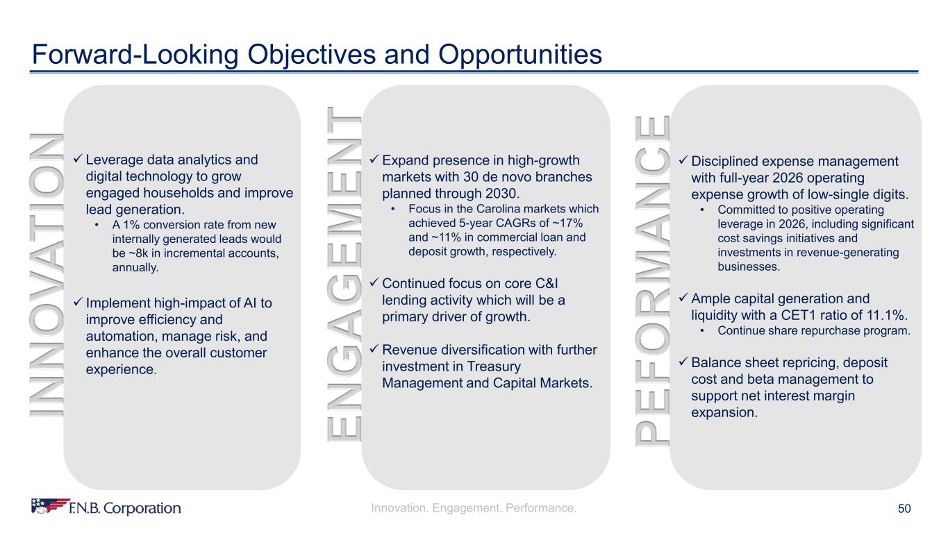 Innovation. Engagement. Performance. 50 Forward-Looking Objectives and Opportunities Leverage data analytics and digital technology to grow engaged households and improve lead generation. • A 1% conversion rate from new internally generated leads would be ~8k in incremental accounts, annually. Implement high-impact of AI to improve efficiency and automation, manage risk, and enhance the overall customer experience. Expand presence in high-growth markets with 30 de novo branches planned through 2030. • Focus in the Carolina markets which achieved 5-year CAGRs of ~17% and ~11% in commercial loan and deposit growth, respectively. Continued focus on core C&I lending activity which will be a primary driver of growth. Revenue diversification with further investment in Treasury Management and Capital Markets. Disciplined expense management with full-year 2026 operating expense growth of low-single digits. • Committed to positive operating leverage in 2026, including significant cost savings initiatives and investments in revenue-generating businesses. Ample capital generation and liquidity with a CET1 ratio of 11.1%. • Continue share repurchase program. Balance sheet repricing, deposit cost and beta management to support net interest margin expansion.