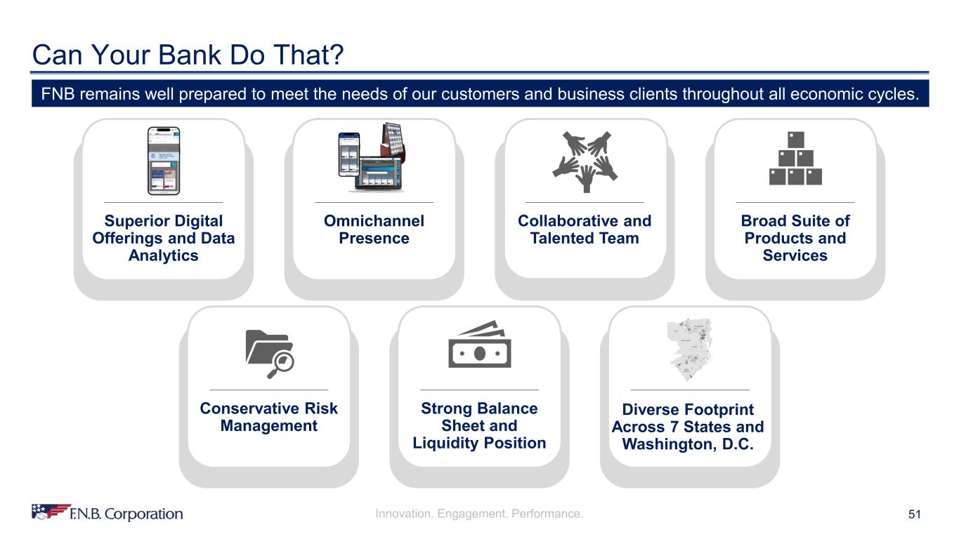 Innovation. Engagement. Performance. 51 Can Your Bank Do That? FNB remains well prepared to meet the needs of our customers and business clients throughout all economic cycles. Superior Digital Offerings and Data Analytics Collaborative and Talented Team Conservative Risk Management Broad Suite of Products and Services Diverse Footprint Across 7 States and Washington, D.C. Omnichannel Presence Strong Balance Sheet and Liquidity Position