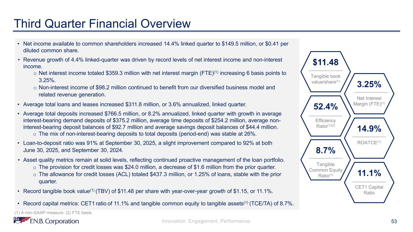 Innovation. Engagement. Performance. 2 Cautionary Statement Regarding Forward-Looking Information This document contains “forward-looking statements” within the meaning of the Private Securities Litigation Reform Act of 1995. Forward-looking statements are those that do not relate to historical facts and that are based on current assumptions, beliefs, estimates, expectations and projections, many of which, by their nature, are inherently uncertain and beyond our control. Forward-looking statements may relate to various matters, including our financial condition, results of operations, plans, objectives, future performance, business or industry, and usually can be identified by the use of forward-looking words, such as “anticipates,” “assumes,” “believes,” “can,” “continues,” “could,” ”enable,” “estimates,” “expects,” “forecasts,” “goal,” “intends,” “likely,” “may,” “might,” “objective,” “plans,” “positioned,” “potential,” “projects,” “remains,” “should,” “target,” “trend,” “will,” “would,” or similar words or expressions or variations thereof, and the negative thereof, but these terms are not the exclusive means of identifying such statements. You should not place undue reliance on forward-looking statements, as they are subject to risks and uncertainties, including, but not limited to, those described below. When considering these forward- looking statements, you should keep in mind these risks and uncertainties, as well as any cautionary statements we may make. There are various important factors that could cause future results to differ materially from historical performance and any forward-looking statements. Factors that might cause such differences, include, but are not limited to: • the credit risk associated with the substantial amount of commercial loans and leases in our loan portfolio; • the volatility of the mortgage banking business; • changes in market interest rates, the U.S. federal government shutdown and the unpredictability of monetary, tax and other policies of government agencies, including tariffs or the imposition of new tariffs, trade wars, barriers or restrictions, or threats of such actions; • the impact of changes in interest rates on the value of our investment securities portfolios; • changes in our ability to obtain liquidity as and when needed to fund our obligations as they come due, including as a result of adverse changes to our credit ratings; • the risk associated with uninsured deposit account balances; • regulatory limits on our ability to receive dividends from our subsidiaries and pay dividends to our shareholders; • our ability to recruit and retain qualified banking professionals; • the financial soundness of other financial institutions and the impact of volatility in the banking sector on us; • changes and instability in economic conditions and financial markets, in the regions in which we operate or otherwise, including a contraction of economic activity, economic downturn or uncertainty and international conflict; • our ability to continue to invest in technological improvements as they become appropriate or necessary; • any interruption in or breach in security of our information systems, or other cybersecurity risks; • risks associated with reliance on third-party vendors and artificial intelligence; • risks associated with the use of models, estimations and assumptions in our business; • the effects of adverse weather events and public health emergencies; • the risks associated with acquiring other banks and financial services businesses, including integration into our existing operations; • the extensive federal and state regulations, supervision and examination governing almost every aspect of our operations, and potential expenses associated with complying with such regulations; • our ability to comply with the consent orders entered into by First National Bank of Pennsylvania with the Department of Justice and the North Carolina State Department of Justice, and related costs and potential reputational harm; • changes in federal, state or local tax rules and regulations or interpretations, or accounting policies, standards and interpretations; • the effects of climate change and related legislative and regulatory initiatives; and • any reputation, credit, interest rate, market, operational, litigation, legal, liquidity, regulatory and compliance risk resulting from developments related to any of the risks discussed above. FNB cautions that the risks identified here are not exhaustive of the types of risks that may adversely impact FNB and actual results may differ materially from those expressed or implied as a result of these risks and uncertainties, including, but not limited to, the risk factors and other uncertainties described under Item 1A. Risk Factors and the Risk Management sections of our 2024 Annual Report on Form 10-K (including the MD&A section), our subsequent 2025 Quarterly Reports on Form 10-Q (including the risk factors and risk management discussions) and our other 2025 filings with the Securities and Exchange Commission (SEC), which are available on our corporate website at https://www.fnb-online.com/about-us/investor- information/reports-and-filings or the SEC’s website at www.sec.gov. We have included our web address as an inactive textual reference only. Information on our website is not part of our SEC filings. You should treat forward-looking statements as speaking only as of the date they are made and based only on information then actually known to FNB. FNB does not undertake, and specifically disclaim any obligation to update or revise any forward-looking statements to reflect the occurrence of events or circumstances after the date of such statements except as required by law.
