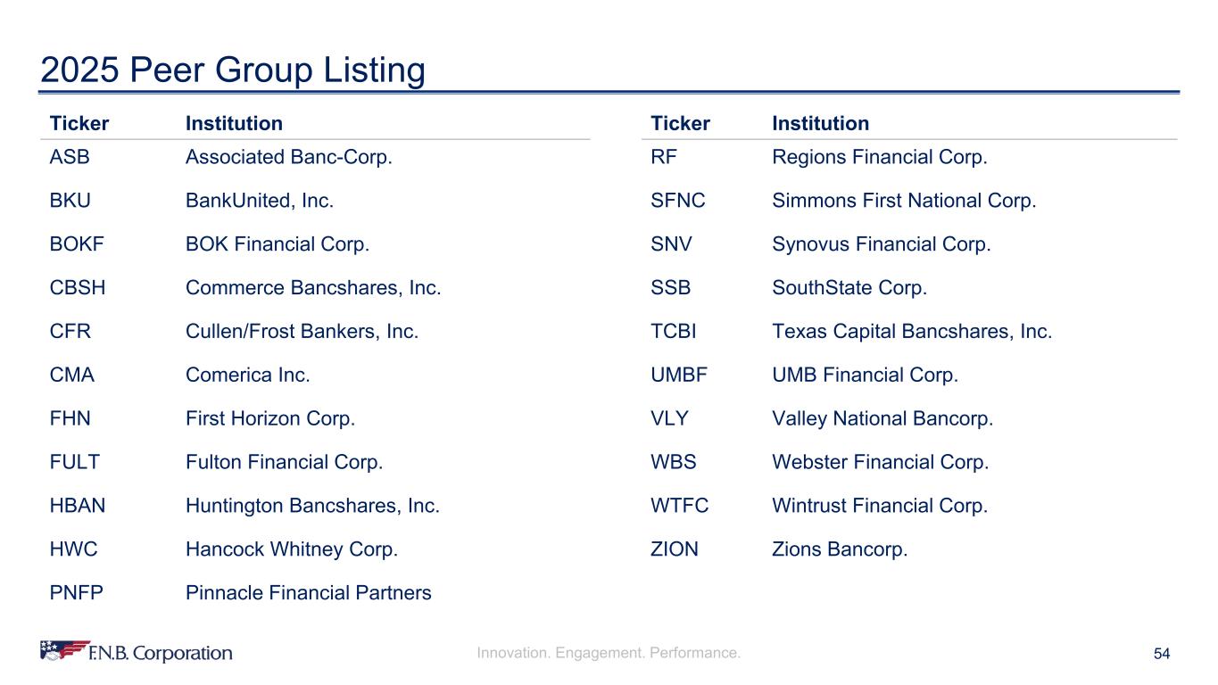Innovation. Engagement. Performance. 54 2025 Peer Group Listing Ticker Institution Ticker Institution ASB Associated Banc-Corp. RF Regions Financial Corp. BKU BankUnited, Inc. SFNC Simmons First National Corp. BOKF BOK Financial Corp. SNV Synovus Financial Corp. CBSH Commerce Bancshares, Inc. SSB SouthState Corp. CFR Cullen/Frost Bankers, Inc. TCBI Texas Capital Bancshares, Inc. CMA Comerica Inc. UMBF UMB Financial Corp. FHN First Horizon Corp. VLY Valley National Bancorp. FULT Fulton Financial Corp. WBS Webster Financial Corp. HBAN Huntington Bancshares, Inc. WTFC Wintrust Financial Corp. HWC Hancock Whitney Corp. ZION Zions Bancorp. PNFP Pinnacle Financial Partners