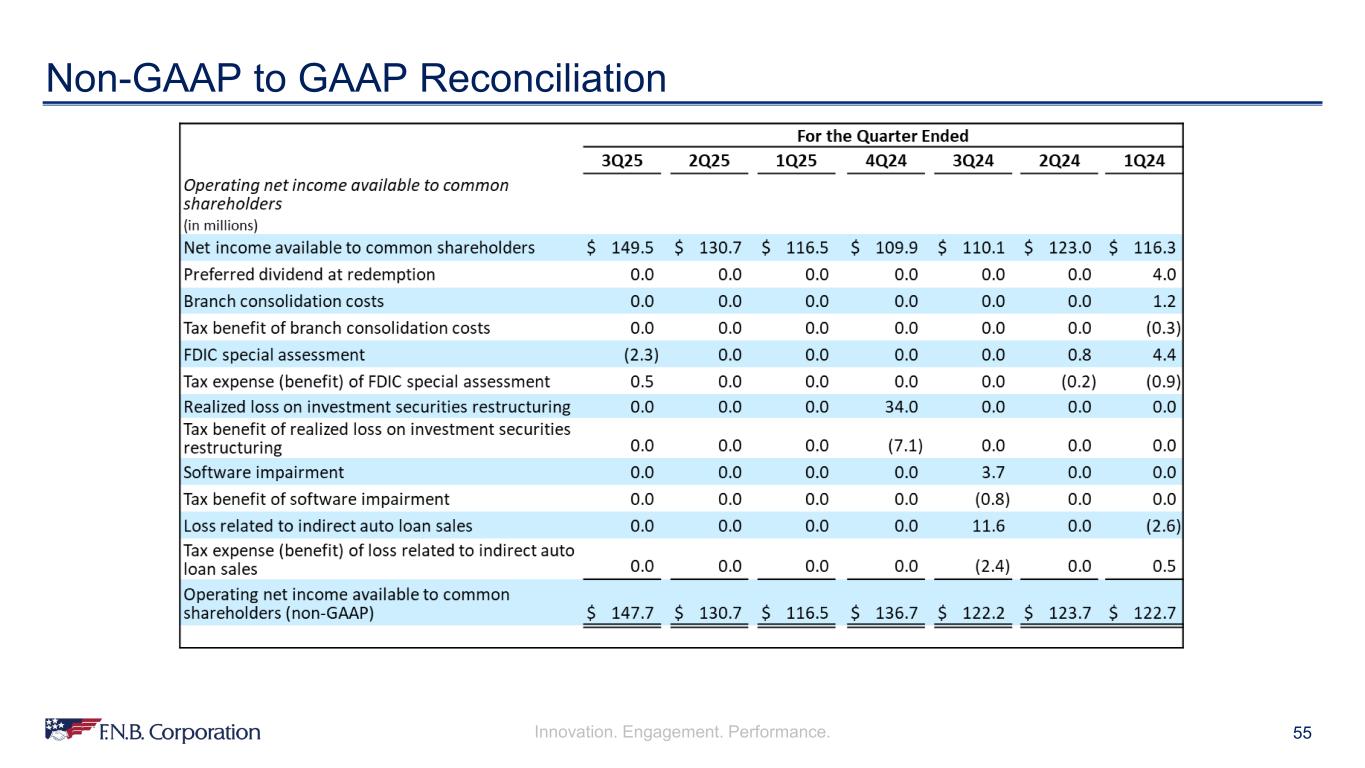 Innovation. Engagement. Performance. 2 Cautionary Statement Regarding Forward-Looking Information This document contains “forward-looking statements” within the meaning of the Private Securities Litigation Reform Act of 1995. Forward-looking statements are those that do not relate to historical facts and that are based on current assumptions, beliefs, estimates, expectations and projections, many of which, by their nature, are inherently uncertain and beyond our control. Forward-looking statements may relate to various matters, including our financial condition, results of operations, plans, objectives, future performance, business or industry, and usually can be identified by the use of forward-looking words, such as “anticipates,” “assumes,” “believes,” “can,” “continues,” “could,” ”enable,” “estimates,” “expects,” “forecasts,” “goal,” “intends,” “likely,” “may,” “might,” “objective,” “plans,” “positioned,” “potential,” “projects,” “remains,” “should,” “target,” “trend,” “will,” “would,” or similar words or expressions or variations thereof, and the negative thereof, but these terms are not the exclusive means of identifying such statements. You should not place undue reliance on forward-looking statements, as they are subject to risks and uncertainties, including, but not limited to, those described below. When considering these forward- looking statements, you should keep in mind these risks and uncertainties, as well as any cautionary statements we may make. There are various important factors that could cause future results to differ materially from historical performance and any forward-looking statements. Factors that might cause such differences, include, but are not limited to: • the credit risk associated with the substantial amount of commercial loans and leases in our loan portfolio; • the volatility of the mortgage banking business; • changes in market interest rates, the U.S. federal government shutdown and the unpredictability of monetary, tax and other policies of government agencies, including tariffs or the imposition of new tariffs, trade wars, barriers or restrictions, or threats of such actions; • the impact of changes in interest rates on the value of our investment securities portfolios; • changes in our ability to obtain liquidity as and when needed to fund our obligations as they come due, including as a result of adverse changes to our credit ratings; • the risk associated with uninsured deposit account balances; • regulatory limits on our ability to receive dividends from our subsidiaries and pay dividends to our shareholders; • our ability to recruit and retain qualified banking professionals; • the financial soundness of other financial institutions and the impact of volatility in the banking sector on us; • changes and instability in economic conditions and financial markets, in the regions in which we operate or otherwise, including a contraction of economic activity, economic downturn or uncertainty and international conflict; • our ability to continue to invest in technological improvements as they become appropriate or necessary; • any interruption in or breach in security of our information systems, or other cybersecurity risks; • risks associated with reliance on third-party vendors and artificial intelligence; • risks associated with the use of models, estimations and assumptions in our business; • the effects of adverse weather events and public health emergencies; • the risks associated with acquiring other banks and financial services businesses, including integration into our existing operations; • the extensive federal and state regulations, supervision and examination governing almost every aspect of our operations, and potential expenses associated with complying with such regulations; • our ability to comply with the consent orders entered into by First National Bank of Pennsylvania with the Department of Justice and the North Carolina State Department of Justice, and related costs and potential reputational harm; • changes in federal, state or local tax rules and regulations or interpretations, or accounting policies, standards and interpretations; • the effects of climate change and related legislative and regulatory initiatives; and • any reputation, credit, interest rate, market, operational, litigation, legal, liquidity, regulatory and compliance risk resulting from developments related to any of the risks discussed above. FNB cautions that the risks identified here are not exhaustive of the types of risks that may adversely impact FNB and actual results may differ materially from those expressed or implied as a result of these risks and uncertainties, including, but not limited to, the risk factors and other uncertainties described under Item 1A. Risk Factors and the Risk Management sections of our 2024 Annual Report on Form 10-K (including the MD&A section), our subsequent 2025 Quarterly Reports on Form 10-Q (including the risk factors and risk management discussions) and our other 2025 filings with the Securities and Exchange Commission (SEC), which are available on our corporate website at https://www.fnb-online.com/about-us/investor- information/reports-and-filings or the SEC’s website at www.sec.gov. We have included our web address as an inactive textual reference only. Information on our website is not part of our SEC filings. You should treat forward-looking statements as speaking only as of the date they are made and based only on information then actually known to FNB. FNB does not undertake, and specifically disclaim any obligation to update or revise any forward-looking statements to reflect the occurrence of events or circumstances after the date of such statements except as required by law.