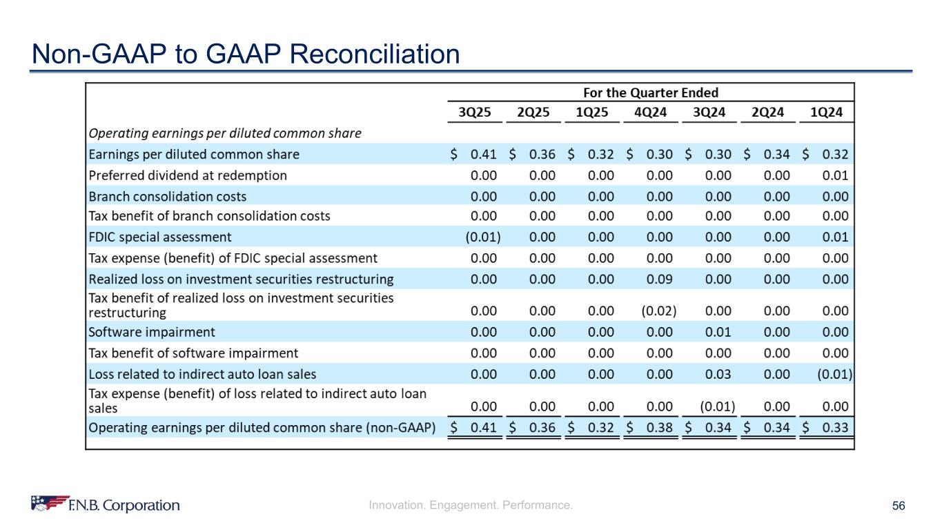 Innovation. Engagement. Performance. 2 Cautionary Statement Regarding Forward-Looking Information This document contains “forward-looking statements” within the meaning of the Private Securities Litigation Reform Act of 1995. Forward-looking statements are those that do not relate to historical facts and that are based on current assumptions, beliefs, estimates, expectations and projections, many of which, by their nature, are inherently uncertain and beyond our control. Forward-looking statements may relate to various matters, including our financial condition, results of operations, plans, objectives, future performance, business or industry, and usually can be identified by the use of forward-looking words, such as “anticipates,” “assumes,” “believes,” “can,” “continues,” “could,” ”enable,” “estimates,” “expects,” “forecasts,” “goal,” “intends,” “likely,” “may,” “might,” “objective,” “plans,” “positioned,” “potential,” “projects,” “remains,” “should,” “target,” “trend,” “will,” “would,” or similar words or expressions or variations thereof, and the negative thereof, but these terms are not the exclusive means of identifying such statements. You should not place undue reliance on forward-looking statements, as they are subject to risks and uncertainties, including, but not limited to, those described below. When considering these forward- looking statements, you should keep in mind these risks and uncertainties, as well as any cautionary statements we may make. There are various important factors that could cause future results to differ materially from historical performance and any forward-looking statements. Factors that might cause such differences, include, but are not limited to: • the credit risk associated with the substantial amount of commercial loans and leases in our loan portfolio; • the volatility of the mortgage banking business; • changes in market interest rates, the U.S. federal government shutdown and the unpredictability of monetary, tax and other policies of government agencies, including tariffs or the imposition of new tariffs, trade wars, barriers or restrictions, or threats of such actions; • the impact of changes in interest rates on the value of our investment securities portfolios; • changes in our ability to obtain liquidity as and when needed to fund our obligations as they come due, including as a result of adverse changes to our credit ratings; • the risk associated with uninsured deposit account balances; • regulatory limits on our ability to receive dividends from our subsidiaries and pay dividends to our shareholders; • our ability to recruit and retain qualified banking professionals; • the financial soundness of other financial institutions and the impact of volatility in the banking sector on us; • changes and instability in economic conditions and financial markets, in the regions in which we operate or otherwise, including a contraction of economic activity, economic downturn or uncertainty and international conflict; • our ability to continue to invest in technological improvements as they become appropriate or necessary; • any interruption in or breach in security of our information systems, or other cybersecurity risks; • risks associated with reliance on third-party vendors and artificial intelligence; • risks associated with the use of models, estimations and assumptions in our business; • the effects of adverse weather events and public health emergencies; • the risks associated with acquiring other banks and financial services businesses, including integration into our existing operations; • the extensive federal and state regulations, supervision and examination governing almost every aspect of our operations, and potential expenses associated with complying with such regulations; • our ability to comply with the consent orders entered into by First National Bank of Pennsylvania with the Department of Justice and the North Carolina State Department of Justice, and related costs and potential reputational harm; • changes in federal, state or local tax rules and regulations or interpretations, or accounting policies, standards and interpretations; • the effects of climate change and related legislative and regulatory initiatives; and • any reputation, credit, interest rate, market, operational, litigation, legal, liquidity, regulatory and compliance risk resulting from developments related to any of the risks discussed above. FNB cautions that the risks identified here are not exhaustive of the types of risks that may adversely impact FNB and actual results may differ materially from those expressed or implied as a result of these risks and uncertainties, including, but not limited to, the risk factors and other uncertainties described under Item 1A. Risk Factors and the Risk Management sections of our 2024 Annual Report on Form 10-K (including the MD&A section), our subsequent 2025 Quarterly Reports on Form 10-Q (including the risk factors and risk management discussions) and our other 2025 filings with the Securities and Exchange Commission (SEC), which are available on our corporate website at https://www.fnb-online.com/about-us/investor- information/reports-and-filings or the SEC’s website at www.sec.gov. We have included our web address as an inactive textual reference only. Information on our website is not part of our SEC filings. You should treat forward-looking statements as speaking only as of the date they are made and based only on information then actually known to FNB. FNB does not undertake, and specifically disclaim any obligation to update or revise any forward-looking statements to reflect the occurrence of events or circumstances after the date of such statements except as required by law.