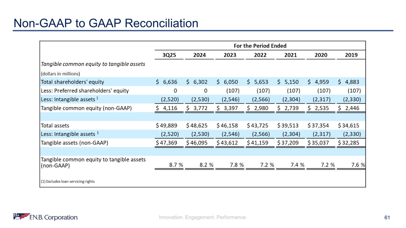 Innovation. Engagement. Performance. 2 Cautionary Statement Regarding Forward-Looking Information This document contains “forward-looking statements” within the meaning of the Private Securities Litigation Reform Act of 1995. Forward-looking statements are those that do not relate to historical facts and that are based on current assumptions, beliefs, estimates, expectations and projections, many of which, by their nature, are inherently uncertain and beyond our control. Forward-looking statements may relate to various matters, including our financial condition, results of operations, plans, objectives, future performance, business or industry, and usually can be identified by the use of forward-looking words, such as “anticipates,” “assumes,” “believes,” “can,” “continues,” “could,” ”enable,” “estimates,” “expects,” “forecasts,” “goal,” “intends,” “likely,” “may,” “might,” “objective,” “plans,” “positioned,” “potential,” “projects,” “remains,” “should,” “target,” “trend,” “will,” “would,” or similar words or expressions or variations thereof, and the negative thereof, but these terms are not the exclusive means of identifying such statements. You should not place undue reliance on forward-looking statements, as they are subject to risks and uncertainties, including, but not limited to, those described below. When considering these forward- looking statements, you should keep in mind these risks and uncertainties, as well as any cautionary statements we may make. There are various important factors that could cause future results to differ materially from historical performance and any forward-looking statements. Factors that might cause such differences, include, but are not limited to: • the credit risk associated with the substantial amount of commercial loans and leases in our loan portfolio; • the volatility of the mortgage banking business; • changes in market interest rates, the U.S. federal government shutdown and the unpredictability of monetary, tax and other policies of government agencies, including tariffs or the imposition of new tariffs, trade wars, barriers or restrictions, or threats of such actions; • the impact of changes in interest rates on the value of our investment securities portfolios; • changes in our ability to obtain liquidity as and when needed to fund our obligations as they come due, including as a result of adverse changes to our credit ratings; • the risk associated with uninsured deposit account balances; • regulatory limits on our ability to receive dividends from our subsidiaries and pay dividends to our shareholders; • our ability to recruit and retain qualified banking professionals; • the financial soundness of other financial institutions and the impact of volatility in the banking sector on us; • changes and instability in economic conditions and financial markets, in the regions in which we operate or otherwise, including a contraction of economic activity, economic downturn or uncertainty and international conflict; • our ability to continue to invest in technological improvements as they become appropriate or necessary; • any interruption in or breach in security of our information systems, or other cybersecurity risks; • risks associated with reliance on third-party vendors and artificial intelligence; • risks associated with the use of models, estimations and assumptions in our business; • the effects of adverse weather events and public health emergencies; • the risks associated with acquiring other banks and financial services businesses, including integration into our existing operations; • the extensive federal and state regulations, supervision and examination governing almost every aspect of our operations, and potential expenses associated with complying with such regulations; • our ability to comply with the consent orders entered into by First National Bank of Pennsylvania with the Department of Justice and the North Carolina State Department of Justice, and related costs and potential reputational harm; • changes in federal, state or local tax rules and regulations or interpretations, or accounting policies, standards and interpretations; • the effects of climate change and related legislative and regulatory initiatives; and • any reputation, credit, interest rate, market, operational, litigation, legal, liquidity, regulatory and compliance risk resulting from developments related to any of the risks discussed above. FNB cautions that the risks identified here are not exhaustive of the types of risks that may adversely impact FNB and actual results may differ materially from those expressed or implied as a result of these risks and uncertainties, including, but not limited to, the risk factors and other uncertainties described under Item 1A. Risk Factors and the Risk Management sections of our 2024 Annual Report on Form 10-K (including the MD&A section), our subsequent 2025 Quarterly Reports on Form 10-Q (including the risk factors and risk management discussions) and our other 2025 filings with the Securities and Exchange Commission (SEC), which are available on our corporate website at https://www.fnb-online.com/about-us/investor- information/reports-and-filings or the SEC’s website at www.sec.gov. We have included our web address as an inactive textual reference only. Information on our website is not part of our SEC filings. You should treat forward-looking statements as speaking only as of the date they are made and based only on information then actually known to FNB. FNB does not undertake, and specifically disclaim any obligation to update or revise any forward-looking statements to reflect the occurrence of events or circumstances after the date of such statements except as required by law.