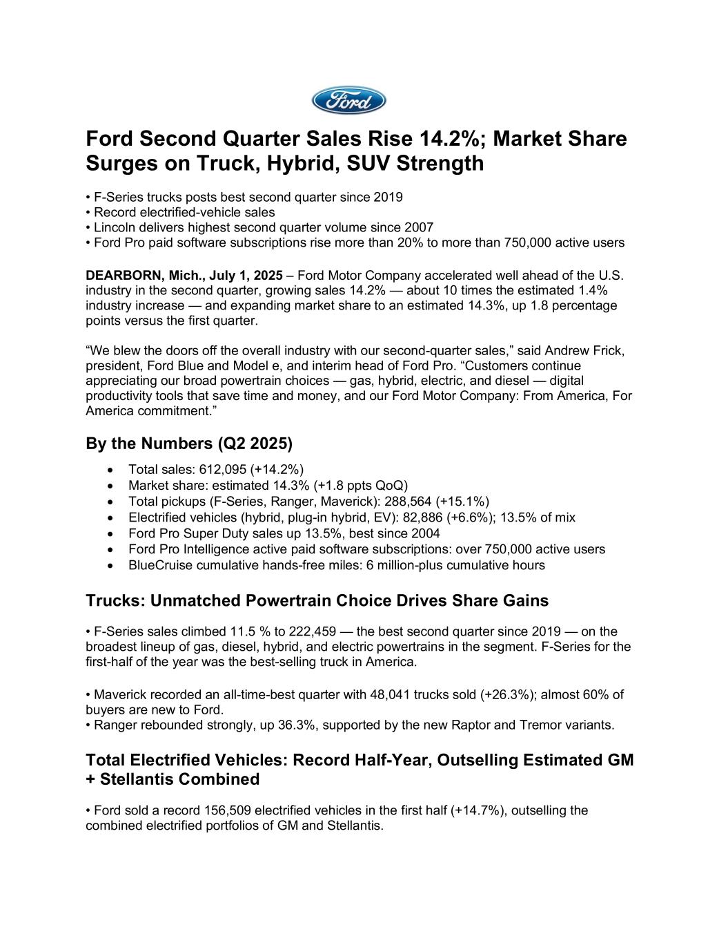 Ford Second Quarter Sales Rise 14.2%; Market Share Surges on Truck, Hybrid, SUV Strength • F-Series trucks posts best second quarter since 2019 • Record electrified-vehicle sales • Lincoln delivers highest second quarter volume since 2007 • Ford Pro paid software subscriptions rise more than 20% to more than 750,000 active users DEARBORN, Mich., July 1, 2025 – Ford Motor Company accelerated well ahead of the U.S. industry in the second quarter, growing sales 14.2% — about 10 times the estimated 1.4% industry increase — and expanding market share to an estimated 14.3%, up 1.8 percentage points versus the first quarter. “We blew the doors off the overall industry with our second-quarter sales,” said Andrew Frick, president, Ford Blue and Model e, and interim head of Ford Pro. “Customers continue appreciating our broad powertrain choices — gas, hybrid, electric, and diesel — digital productivity tools that save time and money, and our Ford Motor Company: From America, For America commitment.” By the Numbers (Q2 2025) • Total sales: 612,095 (+14.2%) • Market share: estimated 14.3% (+1.8 ppts QoQ) • Total pickups (F-Series, Ranger, Maverick): 288,564 (+15.1%) • Electrified vehicles (hybrid, plug-in hybrid, EV): 82,886 (+6.6%); 13.5% of mix • Ford Pro Super Duty sales up 13.5%, best since 2004 • Ford Pro Intelligence active paid software subscriptions: over 750,000 active users • BlueCruise cumulative hands-free miles: 6 million-plus cumulative hours Trucks: Unmatched Powertrain Choice Drives Share Gains • F-Series sales climbed 11.5 % to 222,459 — the best second quarter since 2019 — on the broadest lineup of gas, diesel, hybrid, and electric powertrains in the segment. F-Series for the first-half of the year was the best-selling truck in America. • Maverick recorded an all-time-best quarter with 48,041 trucks sold (+26.3%); almost 60% of buyers are new to Ford. • Ranger rebounded strongly, up 36.3%, supported by the new Raptor and Tremor variants. Total Electrified Vehicles: Record Half-Year, Outselling Estimated GM + Stellantis Combined • Ford sold a record 156,509 electrified vehicles in the first half (+14.7%), outselling the combined electrified portfolios of GM and Stellantis.