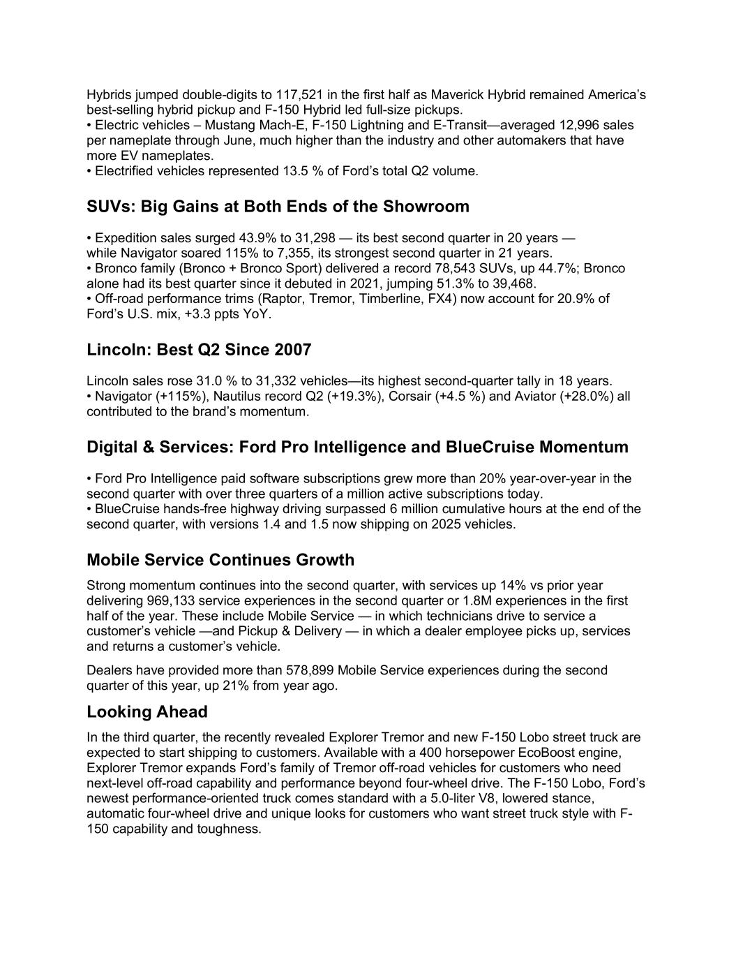 Hybrids jumped double-digits to 117,521 in the first half as Maverick Hybrid remained America’s best-selling hybrid pickup and F-150 Hybrid led full-size pickups. • Electric vehicles – Mustang Mach-E, F-150 Lightning and E-Transit—averaged 12,996 sales per nameplate through June, much higher than the industry and other automakers that have more EV nameplates. • Electrified vehicles represented 13.5 % of Ford’s total Q2 volume. SUVs: Big Gains at Both Ends of the Showroom • Expedition sales surged 43.9% to 31,298 — its best second quarter in 20 years — while Navigator soared 115% to 7,355, its strongest second quarter in 21 years. • Bronco family (Bronco + Bronco Sport) delivered a record 78,543 SUVs, up 44.7%; Bronco alone had its best quarter since it debuted in 2021, jumping 51.3% to 39,468. • Off-road performance trims (Raptor, Tremor, Timberline, FX4) now account for 20.9% of Ford’s U.S. mix, +3.3 ppts YoY. Lincoln: Best Q2 Since 2007 Lincoln sales rose 31.0 % to 31,332 vehicles—its highest second-quarter tally in 18 years. • Navigator (+115%), Nautilus record Q2 (+19.3%), Corsair (+4.5 %) and Aviator (+28.0%) all contributed to the brand’s momentum. Digital & Services: Ford Pro Intelligence and BlueCruise Momentum • Ford Pro Intelligence paid software subscriptions grew more than 20% year-over-year in the second quarter with over three quarters of a million active subscriptions today. • BlueCruise hands-free highway driving surpassed 6 million cumulative hours at the end of the second quarter, with versions 1.4 and 1.5 now shipping on 2025 vehicles. Mobile Service Continues Growth Strong momentum continues into the second quarter, with services up 14% vs prior year delivering 969,133 service experiences in the second quarter or 1.8M experiences in the first half of the year. These include Mobile Service — in which technicians drive to service a customer’s vehicle —and Pickup & Delivery — in which a dealer employee picks up, services and returns a customer’s vehicle. Dealers have provided more than 578,899 Mobile Service experiences during the second quarter of this year, up 21% from year ago. Looking Ahead In the third quarter, the recently revealed Explorer Tremor and new F-150 Lobo street truck are expected to start shipping to customers. Available with a 400 horsepower EcoBoost engine, Explorer Tremor expands Ford’s family of Tremor off-road vehicles for customers who need next-level off-road capability and performance beyond four-wheel drive. The F-150 Lobo, Ford’s newest performance-oriented truck comes standard with a 5.0-liter V8, lowered stance, automatic four-wheel drive and unique looks for customers who want street truck style with F- 150 capability and toughness.