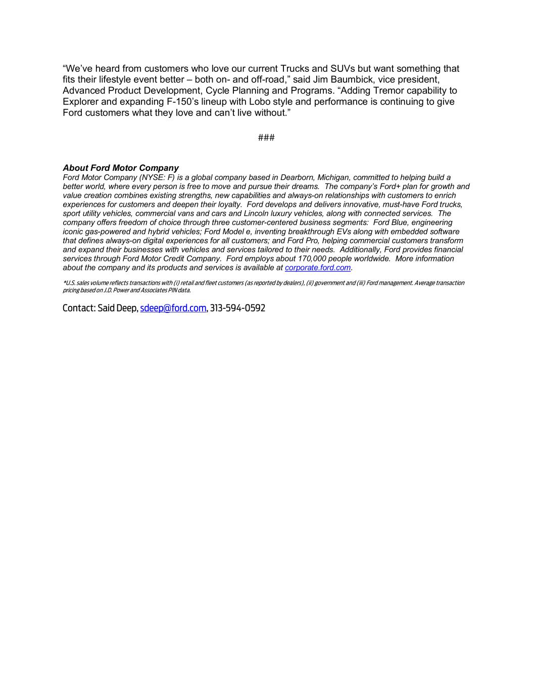 “We’ve heard from customers who love our current Trucks and SUVs but want something that fits their lifestyle event better – both on- and off-road,” said Jim Baumbick, vice president, Advanced Product Development, Cycle Planning and Programs. “Adding Tremor capability to Explorer and expanding F-150’s lineup with Lobo style and performance is continuing to give Ford customers what they love and can’t live without.” ### About Ford Motor Company Ford Motor Company (NYSE: F) is a global company based in Dearborn, Michigan, committed to helping build a better world, where every person is free to move and pursue their dreams. The company’s Ford+ plan for growth and value creation combines existing strengths, new capabilities and always-on relationships with customers to enrich experiences for customers and deepen their loyalty. Ford develops and delivers innovative, must-have Ford trucks, sport utility vehicles, commercial vans and cars and Lincoln luxury vehicles, along with connected services. The company offers freedom of choice through three customer-centered business segments: Ford Blue, engineering iconic gas-powered and hybrid vehicles; Ford Model e, inventing breakthrough EVs along with embedded software that defines always-on digital experiences for all customers; and Ford Pro, helping commercial customers transform and expand their businesses with vehicles and services tailored to their needs. Additionally, Ford provides financial services through Ford Motor Credit Company. Ford employs about 170,000 people worldwide. More information about the company and its products and services is available at corporate.ford.com. *U.S. sales volume reflects transactions with (i) retail and fleet customers (as reported by dealers), (ii) government and (iii) Ford management. Average transaction pricing based on J.D. Power and Associates PIN data. Contact: Said Deep, sdeep@ford.com, 313-594-0592