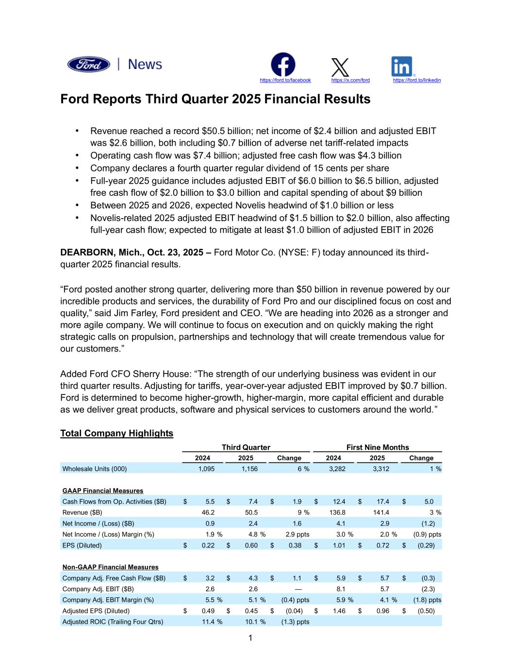1 https://ford.to/facebook https://x.com/ford https://ford.to/linkedin Ford Reports Third Quarter 2025 Financial Results • Revenue reached a record $50.5 billion; net income of $2.4 billion and adjusted EBIT was $2.6 billion, both including $0.7 billion of adverse net tariff-related impacts • Operating cash flow was $7.4 billion; adjusted free cash flow was $4.3 billion • Company declares a fourth quarter regular dividend of 15 cents per share • Full-year 2025 guidance includes adjusted EBIT of $6.0 billion to $6.5 billion, adjusted free cash flow of $2.0 billion to $3.0 billion and capital spending of about $9 billion • Between 2025 and 2026, expected Novelis headwind of $1.0 billion or less • Novelis-related 2025 adjusted EBIT headwind of $1.5 billion to $2.0 billion, also affecting full-year cash flow; expected to mitigate at least $1.0 billion of adjusted EBIT in 2026 DEARBORN, Mich., Oct. 23, 2025 – Ford Motor Co. (NYSE: F) today announced its third- quarter 2025 financial results. “Ford posted another strong quarter, delivering more than $50 billion in revenue powered by our incredible products and services, the durability of Ford Pro and our disciplined focus on cost and quality,” said Jim Farley, Ford president and CEO. “We are heading into 2026 as a stronger and more agile company. We will continue to focus on execution and on quickly making the right strategic calls on propulsion, partnerships and technology that will create tremendous value for our customers.” Added Ford CFO Sherry House: “The strength of our underlying business was evident in our third quarter results. Adjusting for tariffs, year-over-year adjusted EBIT improved by $0.7 billion. Ford is determined to become higher-growth, higher-margin, more capital efficient and durable as we deliver great products, software and physical services to customers around the world.” Total Company Highlights Third Quarter First Nine Months 2024 2025 Change 2024 2025 Change Wholesale Units (000) 1,095 1,156 6 % 3,282 3,312 1 % GAAP Financial Measures Cash Flows from Op. Activities ($B) $ 5.5 $ 7.4 $ 1.9 $ 12.4 $ 17.4 $ 5.0 Revenue ($B) 46.2 50.5 9 % 136.8 141.4 3 % Net Income / (Loss) ($B) 0.9 2.4 1.6 4.1 2.9 (1.2) Net Income / (Loss) Margin (%) 1.9 % 4.8 % 2.9 ppts 3.0 % 2.0 % (0.9) ppts EPS (Diluted) $ 0.22 $ 0.60 $ 0.38 $ 1.01 $ 0.72 $ (0.29) Non-GAAP Financial Measures Company Adj. Free Cash Flow ($B) $ 3.2 $ 4.3 $ 1.1 $ 5.9 $ 5.7 $ (0.3) Company Adj. EBIT ($B) 2.6 2.6 — 8.1 5.7 (2.3) Company Adj. EBIT Margin (%) 5.5 % 5.1 % (0.4) ppts 5.9 % 4.1 % (1.8) ppts Adjusted EPS (Diluted) $ 0.49 $ 0.45 $ (0.04) $ 1.46 $ 0.96 $ (0.50) Adjusted ROIC (Trailing Four Qtrs) 11.4 % 10.1 % (1.3) ppts
