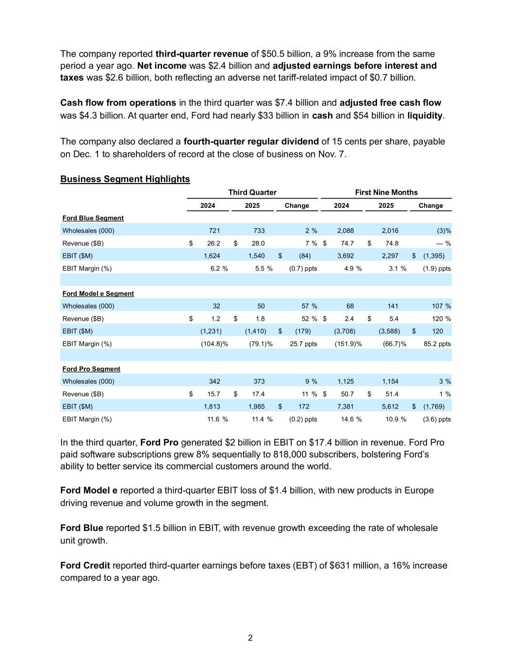 2 The company reported third-quarter revenue of $50.5 billion, a 9% increase from the same period a year ago. Net income was $2.4 billion and adjusted earnings before interest and taxes was $2.6 billion, both reflecting an adverse net tariff-related impact of $0.7 billion. Cash flow from operations in the third quarter was $7.4 billion and adjusted free cash flow was $4.3 billion. At quarter end, Ford had nearly $33 billion in cash and $54 billion in liquidity. The company also declared a fourth-quarter regular dividend of 15 cents per share, payable on Dec. 1 to shareholders of record at the close of business on Nov. 7. Business Segment Highlights Third Quarter First Nine Months 2024 2025 Change 2024 2025 Change Ford Blue Segment Wholesales (000) 721 733 2 % 2,088 2,016 (3)% Revenue ($B) $ 26.2 $ 28.0 7 % $ 74.7 $ 74.8 — % EBIT ($M) 1,624 1,540 $ (84) 3,692 2,297 $ (1,395) EBIT Margin (%) 6.2 % 5.5 % (0.7) ppts 4.9 % 3.1 % (1.9) ppts Ford Model e Segment Wholesales (000) 32 50 57 % 68 141 107 % Revenue ($B) $ 1.2 $ 1.8 52 % $ 2.4 $ 5.4 120 % EBIT ($M) (1,231) (1,410) $ (179) (3,708) (3,588) $ 120 EBIT Margin (%) (104.8)% (79.1) % 25.7 ppts (151.9)% (66.7) % 85.2 ppts Ford Pro Segment Wholesales (000) 342 373 9 % 1,125 1,154 3 % Revenue ($B) $ 15.7 $ 17.4 11 % $ 50.7 $ 51.4 1 % EBIT ($M) 1,813 1,985 $ 172 7,381 5,612 $ (1,769) EBIT Margin (%) 11.6 % 11.4 % (0.2) ppts 14.6 % 10.9 % (3.6) ppts In the third quarter, Ford Pro generated $2 billion in EBIT on $17.4 billion in revenue. Ford Pro paid software subscriptions grew 8% sequentially to 818,000 subscribers, bolstering Ford’s ability to better service its commercial customers around the world. Ford Model e reported a third-quarter EBIT loss of $1.4 billion, with new products in Europe driving revenue and volume growth in the segment. Ford Blue reported $1.5 billion in EBIT, with revenue growth exceeding the rate of wholesale unit growth. Ford Credit reported third-quarter earnings before taxes (EBT) of $631 million, a 16% increase compared to a year ago.