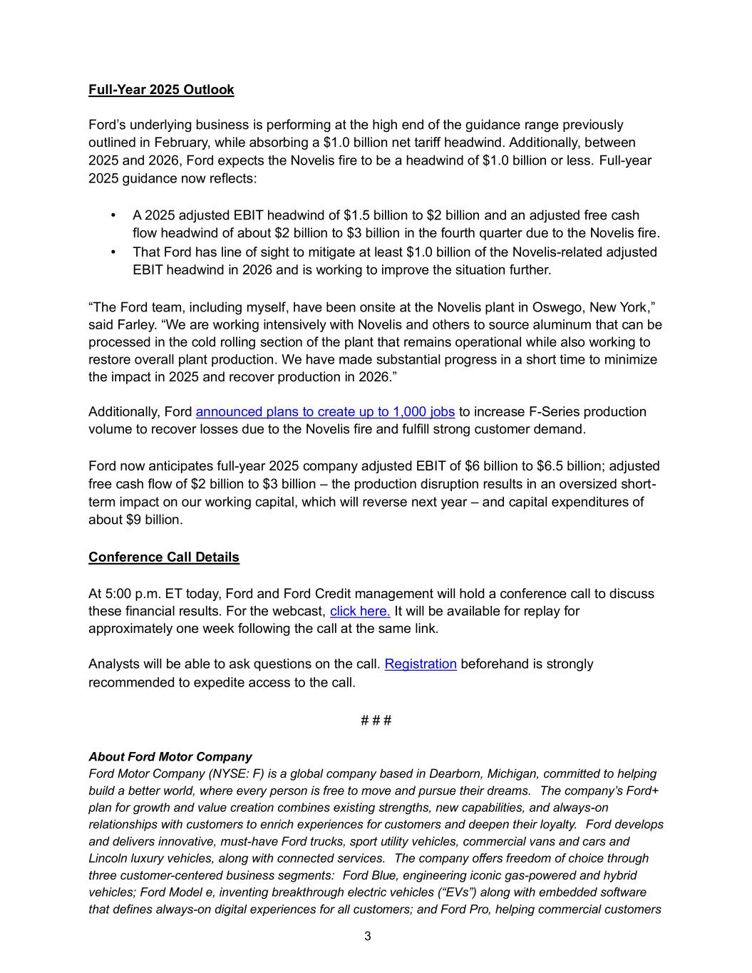 3 Full-Year 2025 Outlook Ford’s underlying business is performing at the high end of the guidance range previously outlined in February, while absorbing a $1.0 billion net tariff headwind. Additionally, between 2025 and 2026, Ford expects the Novelis fire to be a headwind of $1.0 billion or less. Full-year 2025 guidance now reflects: • A 2025 adjusted EBIT headwind of $1.5 billion to $2 billion and an adjusted free cash flow headwind of about $2 billion to $3 billion in the fourth quarter due to the Novelis fire. • That Ford has line of sight to mitigate at least $1.0 billion of the Novelis-related adjusted EBIT headwind in 2026 and is working to improve the situation further. “The Ford team, including myself, have been onsite at the Novelis plant in Oswego, New York,” said Farley. “We are working intensively with Novelis and others to source aluminum that can be processed in the cold rolling section of the plant that remains operational while also working to restore overall plant production. We have made substantial progress in a short time to minimize the impact in 2025 and recover production in 2026.” Additionally, Ford announced plans to create up to 1,000 jobs to increase F-Series production volume to recover losses due to the Novelis fire and fulfill strong customer demand. Ford now anticipates full-year 2025 company adjusted EBIT of $6 billion to $6.5 billion; adjusted free cash flow of $2 billion to $3 billion – the production disruption results in an oversized short- term impact on our working capital, which will reverse next year – and capital expenditures of about $9 billion. Conference Call Details At 5:00 p.m. ET today, Ford and Ford Credit management will hold a conference call to discuss these financial results. For the webcast, click here. It will be available for replay for approximately one week following the call at the same link. Analysts will be able to ask questions on the call. Registration beforehand is strongly recommended to expedite access to the call. # # # About Ford Motor Company Ford Motor Company (NYSE: F) is a global company based in Dearborn, Michigan, committed to helping build a better world, where every person is free to move and pursue their dreams. The company’s Ford+ plan for growth and value creation combines existing strengths, new capabilities, and always-on relationships with customers to enrich experiences for customers and deepen their loyalty. Ford develops and delivers innovative, must-have Ford trucks, sport utility vehicles, commercial vans and cars and Lincoln luxury vehicles, along with connected services. The company offers freedom of choice through three customer-centered business segments: Ford Blue, engineering iconic gas-powered and hybrid vehicles; Ford Model e, inventing breakthrough electric vehicles (“EVs”) along with embedded software that defines always-on digital experiences for all customers; and Ford Pro, helping commercial customers