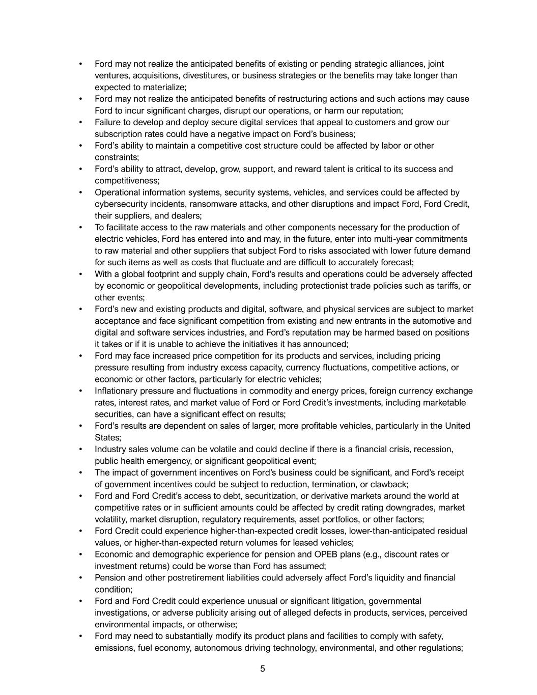 5 • Ford may not realize the anticipated benefits of existing or pending strategic alliances, joint ventures, acquisitions, divestitures, or business strategies or the benefits may take longer than expected to materialize; • Ford may not realize the anticipated benefits of restructuring actions and such actions may cause Ford to incur significant charges, disrupt our operations, or harm our reputation; • Failure to develop and deploy secure digital services that appeal to customers and grow our subscription rates could have a negative impact on Ford’s business; • Ford’s ability to maintain a competitive cost structure could be affected by labor or other constraints; • Ford’s ability to attract, develop, grow, support, and reward talent is critical to its success and competitiveness; • Operational information systems, security systems, vehicles, and services could be affected by cybersecurity incidents, ransomware attacks, and other disruptions and impact Ford, Ford Credit, their suppliers, and dealers; • To facilitate access to the raw materials and other components necessary for the production of electric vehicles, Ford has entered into and may, in the future, enter into multi-year commitments to raw material and other suppliers that subject Ford to risks associated with lower future demand for such items as well as costs that fluctuate and are difficult to accurately forecast; • With a global footprint and supply chain, Ford’s results and operations could be adversely affected by economic or geopolitical developments, including protectionist trade policies such as tariffs, or other events; • Ford’s new and existing products and digital, software, and physical services are subject to market acceptance and face significant competition from existing and new entrants in the automotive and digital and software services industries, and Ford’s reputation may be harmed based on positions it takes or if it is unable to achieve the initiatives it has announced; • Ford may face increased price competition for its products and services, including pricing pressure resulting from industry excess capacity, currency fluctuations, competitive actions, or economic or other factors, particularly for electric vehicles; • Inflationary pressure and fluctuations in commodity and energy prices, foreign currency exchange rates, interest rates, and market value of Ford or Ford Credit’s investments, including marketable securities, can have a significant effect on results; • Ford’s results are dependent on sales of larger, more profitable vehicles, particularly in the United States; • Industry sales volume can be volatile and could decline if there is a financial crisis, recession, public health emergency, or significant geopolitical event; • The impact of government incentives on Ford’s business could be significant, and Ford’s receipt of government incentives could be subject to reduction, termination, or clawback; • Ford and Ford Credit’s access to debt, securitization, or derivative markets around the world at competitive rates or in sufficient amounts could be affected by credit rating downgrades, market volatility, market disruption, regulatory requirements, asset portfolios, or other factors; • Ford Credit could experience higher-than-expected credit losses, lower-than-anticipated residual values, or higher-than-expected return volumes for leased vehicles; • Economic and demographic experience for pension and OPEB plans (e.g., discount rates or investment returns) could be worse than Ford has assumed; • Pension and other postretirement liabilities could adversely affect Ford’s liquidity and financial condition; • Ford and Ford Credit could experience unusual or significant litigation, governmental investigations, or adverse publicity arising out of alleged defects in products, services, perceived environmental impacts, or otherwise; • Ford may need to substantially modify its product plans and facilities to comply with safety, emissions, fuel economy, autonomous driving technology, environmental, and other regulations;