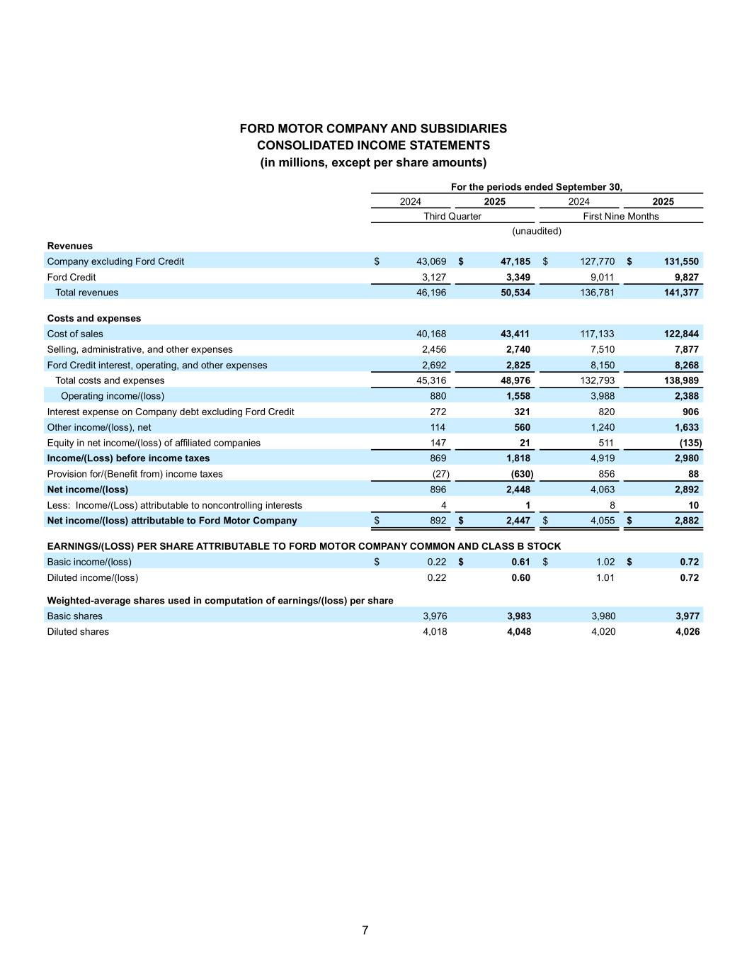 7 FORD MOTOR COMPANY AND SUBSIDIARIES CONSOLIDATED INCOME STATEMENTS (in millions, except per share amounts) For the periods ended September 30, 2024 2025 2024 2025 Third Quarter First Nine Months (unaudited) Revenues Company excluding Ford Credit $ 43,069 $ 47,185 $ 127,770 $ 131,550 Ford Credit 3,127 3,349 9,011 9,827 Total revenues 46,196 50,534 136,781 141,377 Costs and expenses Cost of sales 40,168 43,411 117,133 122,844 Selling, administrative, and other expenses 2,456 2,740 7,510 7,877 Ford Credit interest, operating, and other expenses 2,692 2,825 8,150 8,268 Total costs and expenses 45,316 48,976 132,793 138,989 Operating income/(loss) 880 1,558 3,988 2,388 Interest expense on Company debt excluding Ford Credit 272 321 820 906 Other income/(loss), net 114 560 1,240 1,633 Equity in net income/(loss) of affiliated companies 147 21 511 (135) Income/(Loss) before income taxes 869 1,818 4,919 2,980 Provision for/(Benefit from) income taxes (27) (630) 856 88 Net income/(loss) 896 2,448 4,063 2,892 Less: Income/(Loss) attributable to noncontrolling interests 4 1 8 10 Net income/(loss) attributable to Ford Motor Company $ 892 $ 2,447 $ 4,055 $ 2,882 EARNINGS/(LOSS) PER SHARE ATTRIBUTABLE TO FORD MOTOR COMPANY COMMON AND CLASS B STOCK Basic income/(loss) $ 0.22 $ 0.61 $ 1.02 $ 0.72 Diluted income/(loss) 0.22 0.60 1.01 0.72 Weighted-average shares used in computation of earnings/(loss) per share Basic shares 3,976 3,983 3,980 3,977 Diluted shares 4,018 4,048 4,020 4,026