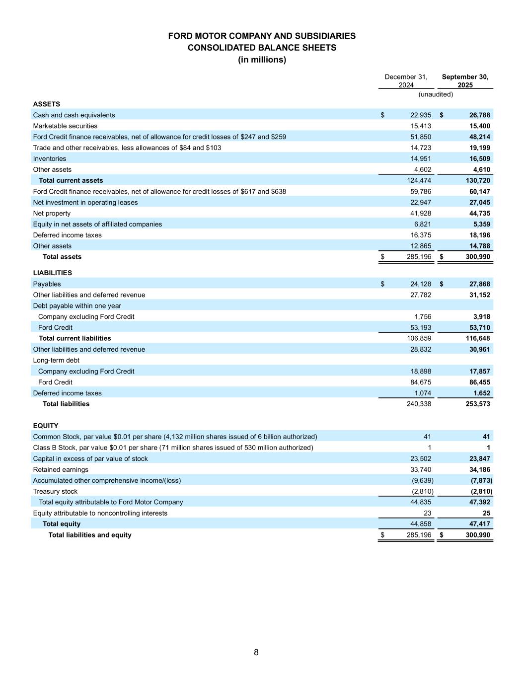 8 FORD MOTOR COMPANY AND SUBSIDIARIES CONSOLIDATED BALANCE SHEETS (in millions) December 31, 2024 September 30, 2025 (unaudited) ASSETS Cash and cash equivalents $ 22,935 $ 26,788 Marketable securities 15,413 15,400 Ford Credit finance receivables, net of allowance for credit losses of $247 and $259 51,850 48,214 Trade and other receivables, less allowances of $84 and $103 14,723 19,199 Inventories 14,951 16,509 Other assets 4,602 4,610 Total current assets 124,474 130,720 Ford Credit finance receivables, net of allowance for credit losses of $617 and $638 59,786 60,147 Net investment in operating leases 22,947 27,045 Net property 41,928 44,735 Equity in net assets of affiliated companies 6,821 5,359 Deferred income taxes 16,375 18,196 Other assets 12,865 14,788 Total assets $ 285,196 $ 300,990 LIABILITIES Payables $ 24,128 $ 27,868 Other liabilities and deferred revenue 27,782 31,152 Debt payable within one year Company excluding Ford Credit 1,756 3,918 Ford Credit 53,193 53,710 Total current liabilities 106,859 116,648 Other liabilities and deferred revenue 28,832 30,961 Long-term debt Company excluding Ford Credit 18,898 17,857 Ford Credit 84,675 86,455 Deferred income taxes 1,074 1,652 Total liabilities 240,338 253,573 EQUITY Common Stock, par value $0.01 per share (4,132 million shares issued of 6 billion authorized) 41 41 Class B Stock, par value $0.01 per share (71 million shares issued of 530 million authorized) 1 1 Capital in excess of par value of stock 23,502 23,847 Retained earnings 33,740 34,186 Accumulated other comprehensive income/(loss) (9,639) (7,873) Treasury stock (2,810) (2,810) Total equity attributable to Ford Motor Company 44,835 47,392 Equity attributable to noncontrolling interests 23 25 Total equity 44,858 47,417 Total liabilities and equity $ 285,196 $ 300,990
