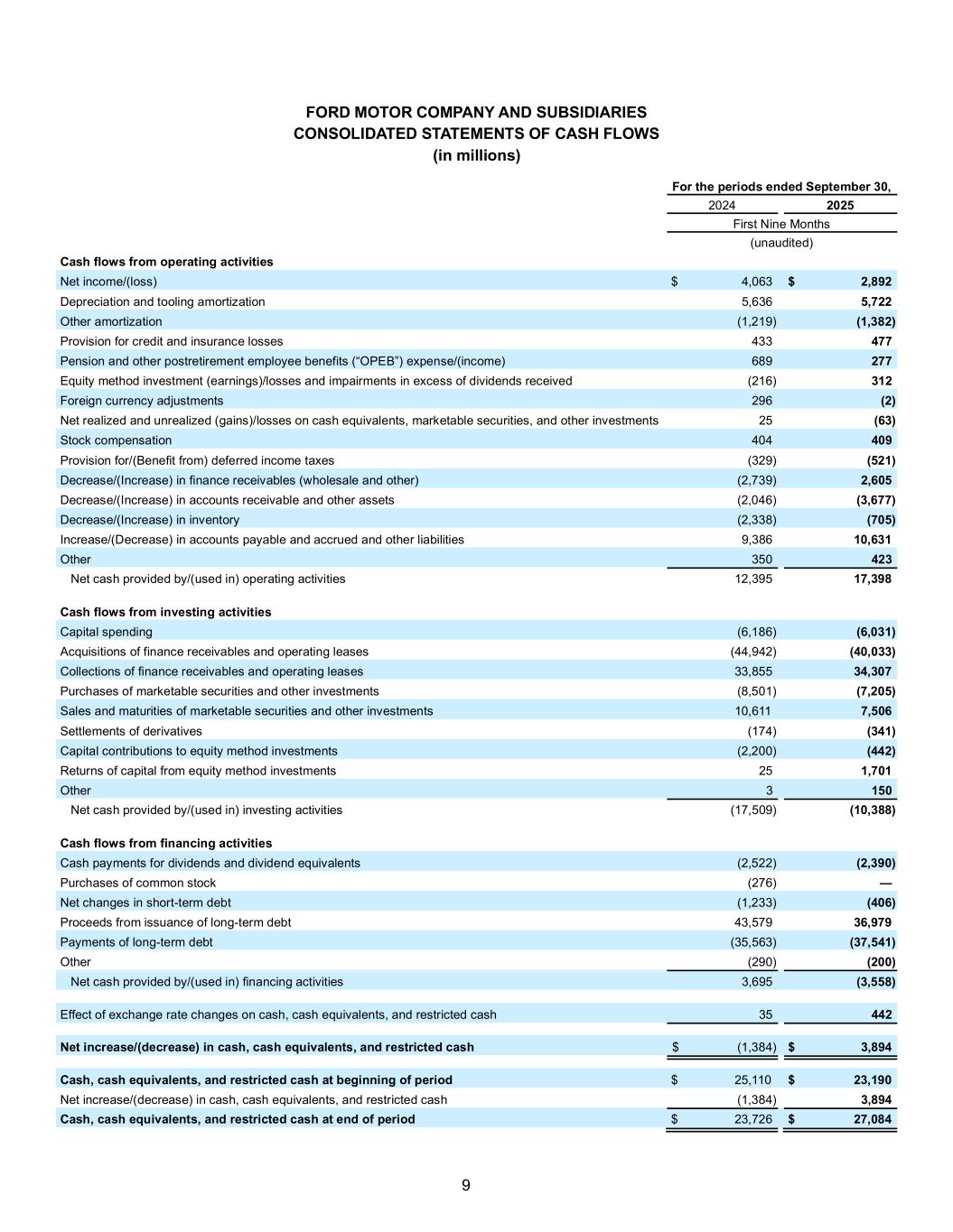 9 FORD MOTOR COMPANY AND SUBSIDIARIES CONSOLIDATED STATEMENTS OF CASH FLOWS (in millions) For the periods ended September 30, 2024 2025 First Nine Months (unaudited) Cash flows from operating activities Net income/(loss) $ 4,063 $ 2,892 Depreciation and tooling amortization 5,636 5,722 Other amortization (1,219) (1,382) Provision for credit and insurance losses 433 477 Pension and other postretirement employee benefits (“OPEB”) expense/(income) 689 277 Equity method investment (earnings)/losses and impairments in excess of dividends received (216) 312 Foreign currency adjustments 296 (2) Net realized and unrealized (gains)/losses on cash equivalents, marketable securities, and other investments 25 (63) Stock compensation 404 409 Provision for/(Benefit from) deferred income taxes (329) (521) Decrease/(Increase) in finance receivables (wholesale and other) (2,739) 2,605 Decrease/(Increase) in accounts receivable and other assets (2,046) (3,677) Decrease/(Increase) in inventory (2,338) (705) Increase/(Decrease) in accounts payable and accrued and other liabilities 9,386 10,631 Other 350 423 Net cash provided by/(used in) operating activities 12,395 17,398 Cash flows from investing activities Capital spending (6,186) (6,031) Acquisitions of finance receivables and operating leases (44,942) (40,033) Collections of finance receivables and operating leases 33,855 34,307 Purchases of marketable securities and other investments (8,501) (7,205) Sales and maturities of marketable securities and other investments 10,611 7,506 Settlements of derivatives (174) (341) Capital contributions to equity method investments (2,200) (442) Returns of capital from equity method investments 25 1,701 Other 3 150 Net cash provided by/(used in) investing activities (17,509) (10,388) Cash flows from financing activities Cash payments for dividends and dividend equivalents (2,522) (2,390) Purchases of common stock (276) — Net changes in short-term debt (1,233) (406) Proceeds from issuance of long-term debt 43,579 36,979 Payments of long-term debt (35,563) (37,541) Other (290) (200) Net cash provided by/(used in) financing activities 3,695 (3,558) Effect of exchange rate changes on cash, cash equivalents, and restricted cash 35 442 Net increase/(decrease) in cash, cash equivalents, and restricted cash $ (1,384) $ 3,894 Cash, cash equivalents, and restricted cash at beginning of period $ 25,110 $ 23,190 Net increase/(decrease) in cash, cash equivalents, and restricted cash (1,384) 3,894 Cash, cash equivalents, and restricted cash at end of period $ 23,726 $ 27,084